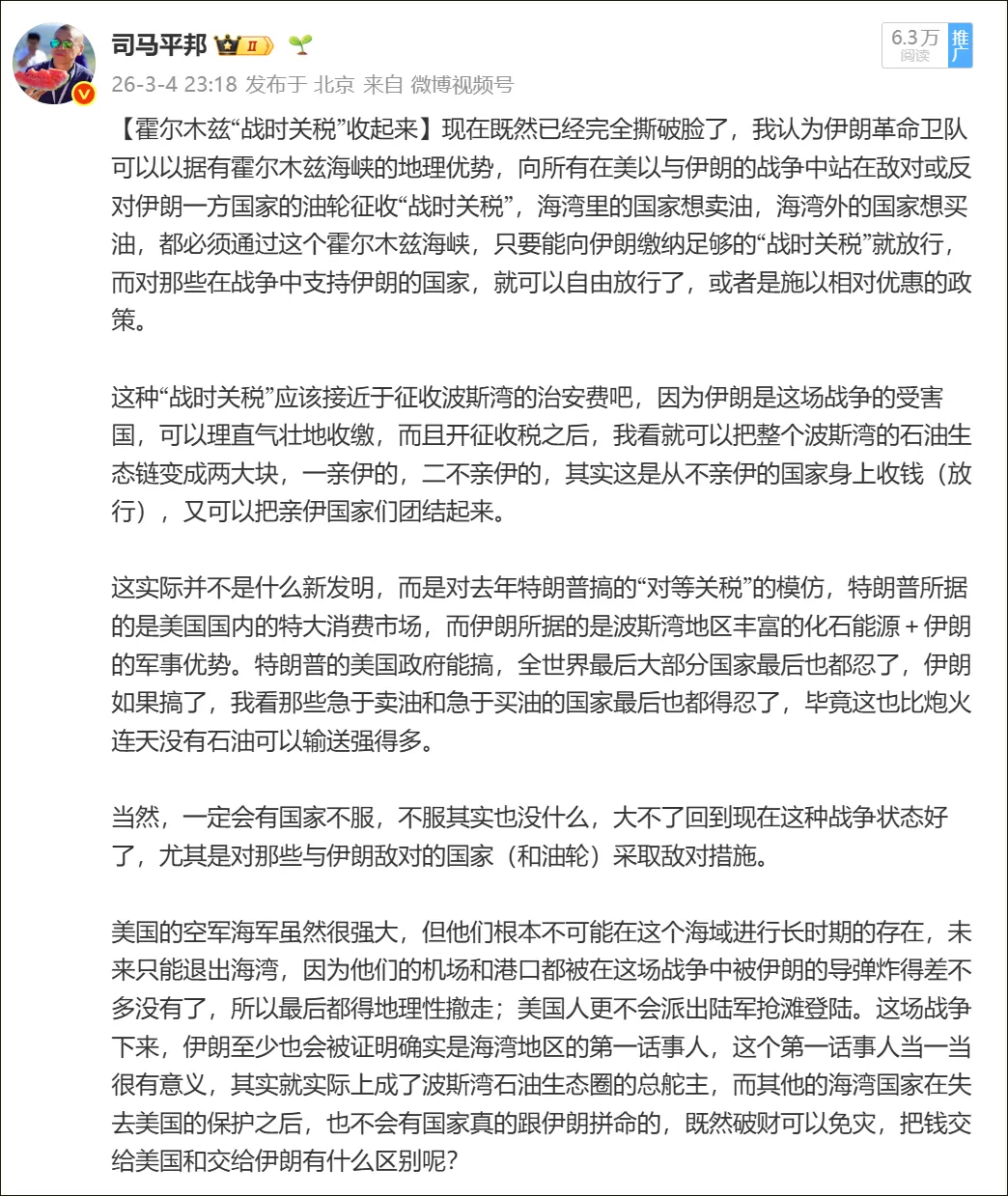 因为我可能是世界上最早提醒他们,可以在霍尔木兹海峡收取“战时关税”的那个人,早在北京时间3月4号晚上23点18分,我就在自媒体发出了这样的建议,有截图为证!