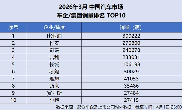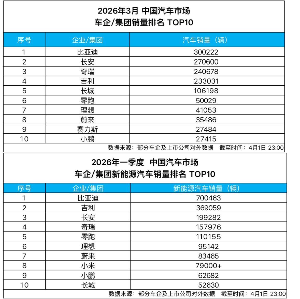 比亚迪发布2026年3月产销数据,单月总销量达300222辆,突破30万辆大关,3月单月中国车企销冠,虽然对于比亚迪破30万辆这件事情我们没有太多的触动了,毕竟比亚迪每月的销量都是一骑绝尘。 连续58个月蝉联中国新能源汽车销量冠军,这件事情,细细想来,有点恐怖。 截至目前,比亚迪新能源汽车累计销量已超1580 万辆,一季度累计销售 700463 辆。 王朝 & 海洋系列贡献262327 辆核心销量 方程豹销量25926 辆,同比大涨 222% 腾势销量7133 辆,第二代腾势 D9 也开启预售了; 仰望销量307 辆,同比增长超 130% 新能源插混到纯电齐发力,成为一季度新能源销冠的双冠王,从国民的几万到高端奢侈的百万,比亚迪的成功就是当下汽车工业规模性的成功,这是一个典范。 比亚迪全年营收首破8000亿元 净利润达326亿元 新能源销量460.24万辆,蝉联全球销冠 海外销量首破百万辆大关【来自懂车帝车友圈】