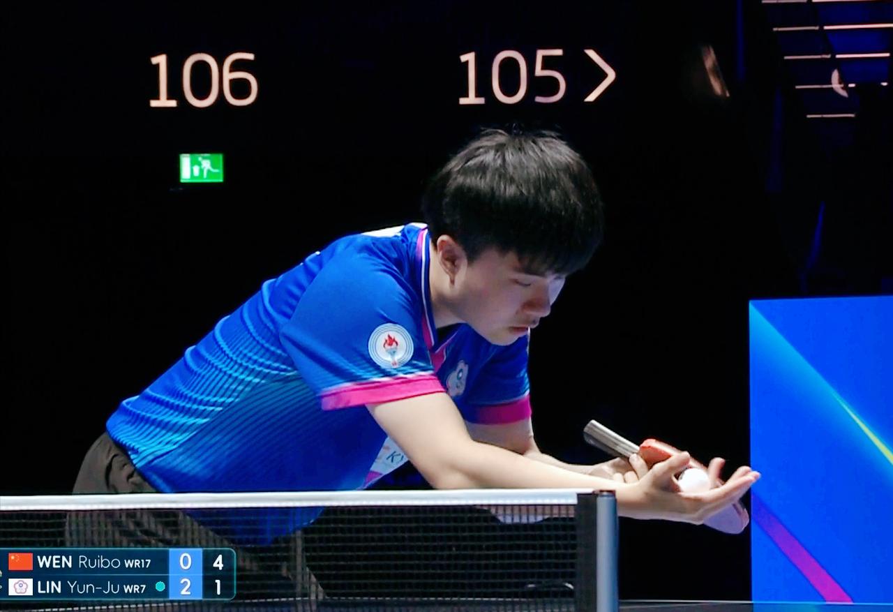 我去!林昀儒内心得有多慌,连续发了6个擦网球。 前两局林昀儒2:0领先, 第三局 温瑞博开长球, 防止林昀儒拧拉, 直接打相持, 4:1开局, 此时林昀儒也紧张了, 连续发了6个擦网球, 这局温瑞博起飞了, 8:1开局, 10:4拿到局点, 11;5拿下