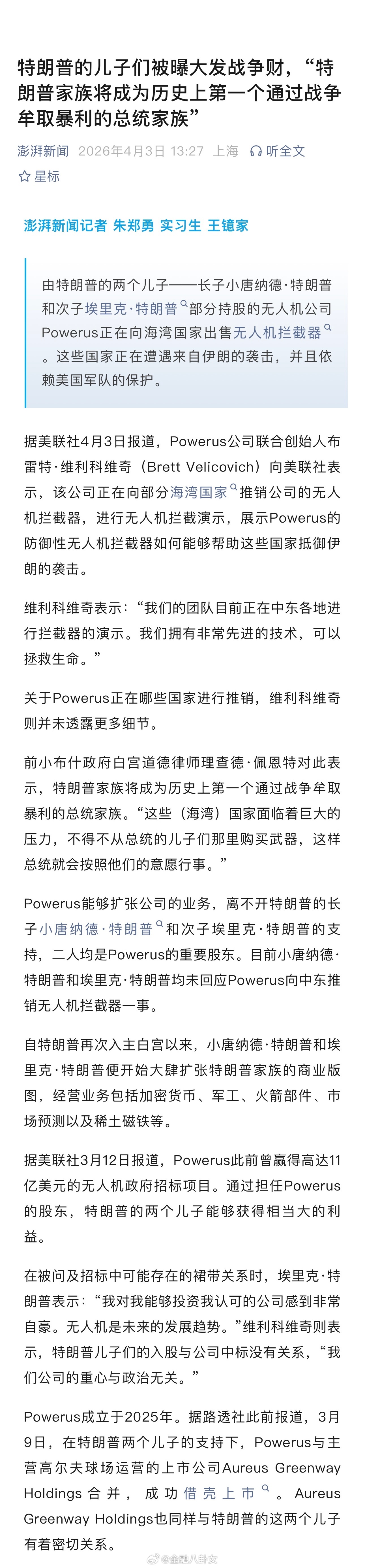 特朗普的儿子们被曝大发战争财,“特朗普家族将成为历史上第一个通过战争牟取暴利的总统家族”