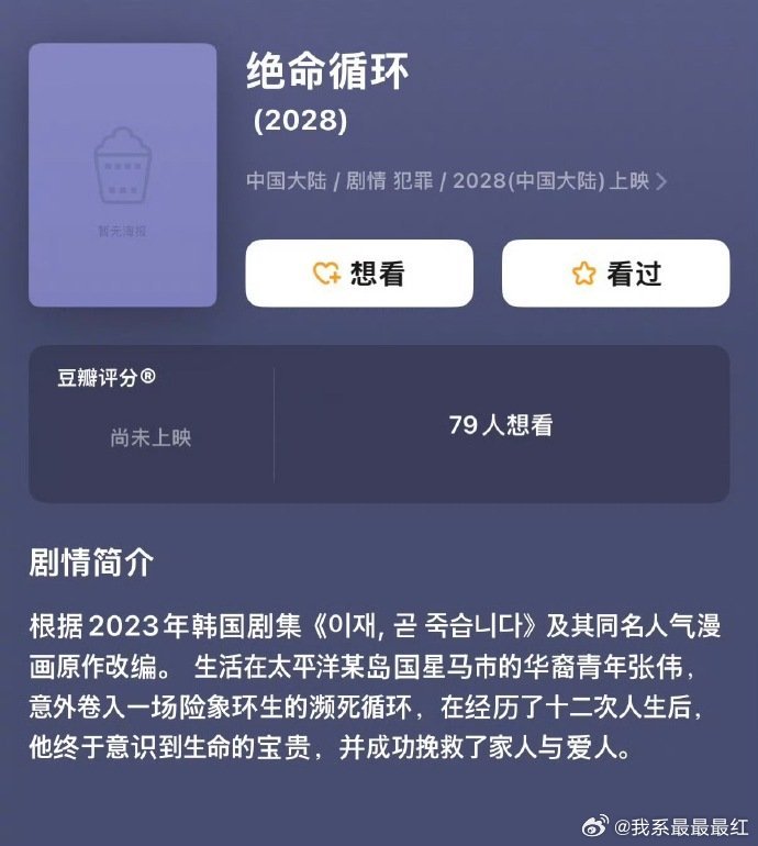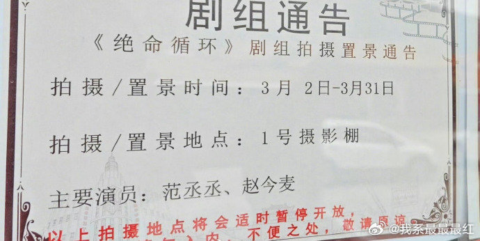 电影《绝命循环》剧组通告 主演范丞丞 赵今麦导演张壹男(张艺谋儿子)