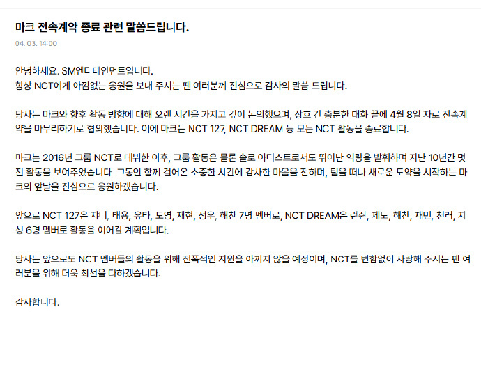 公司与李马克就今后的活动方向进行了长时间的深入沟通,在经过充分的对话后,双方达成一致,将于4月8日正式终止专属合约。因此,李马克将结束包括NCT 127、NCT DREAM在内的所有NCT相关活动。