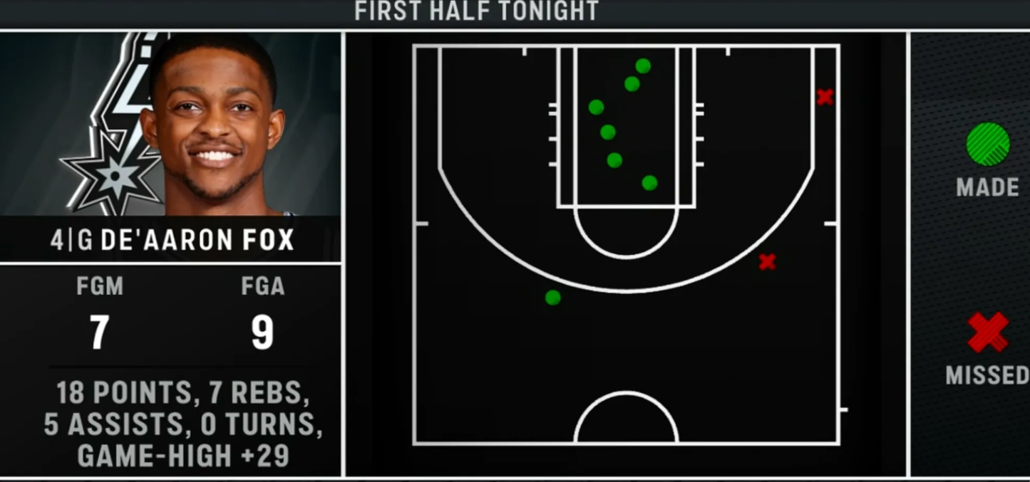 文班休战,福克斯半场9中7,命中位置犹如北斗七星?