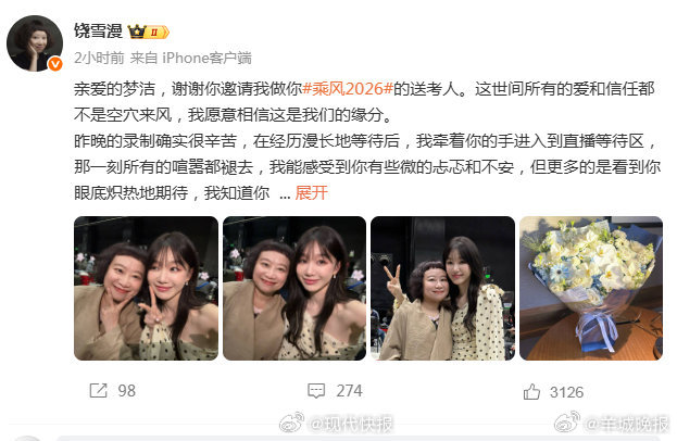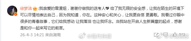 #徐梦洁回应邀请饶雪漫做送考人#【#徐梦洁刻在骨子里的温柔教养#】4月3日,发长文感谢邀请自己做《#乘风2026#》送考人。她晒出在直播等待区和徐梦洁的相处细节,表示“很多很多的小细节,我都能感受到这不仅是礼貌的客套,而是你刻在骨子里的温柔和教养。”