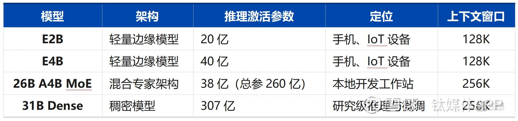 四款模型,四个战场Gemma 4此次一口气释放了四个规格,覆盖了从端侧嵌入式设备到本地开发工作站的完整算力梯度。