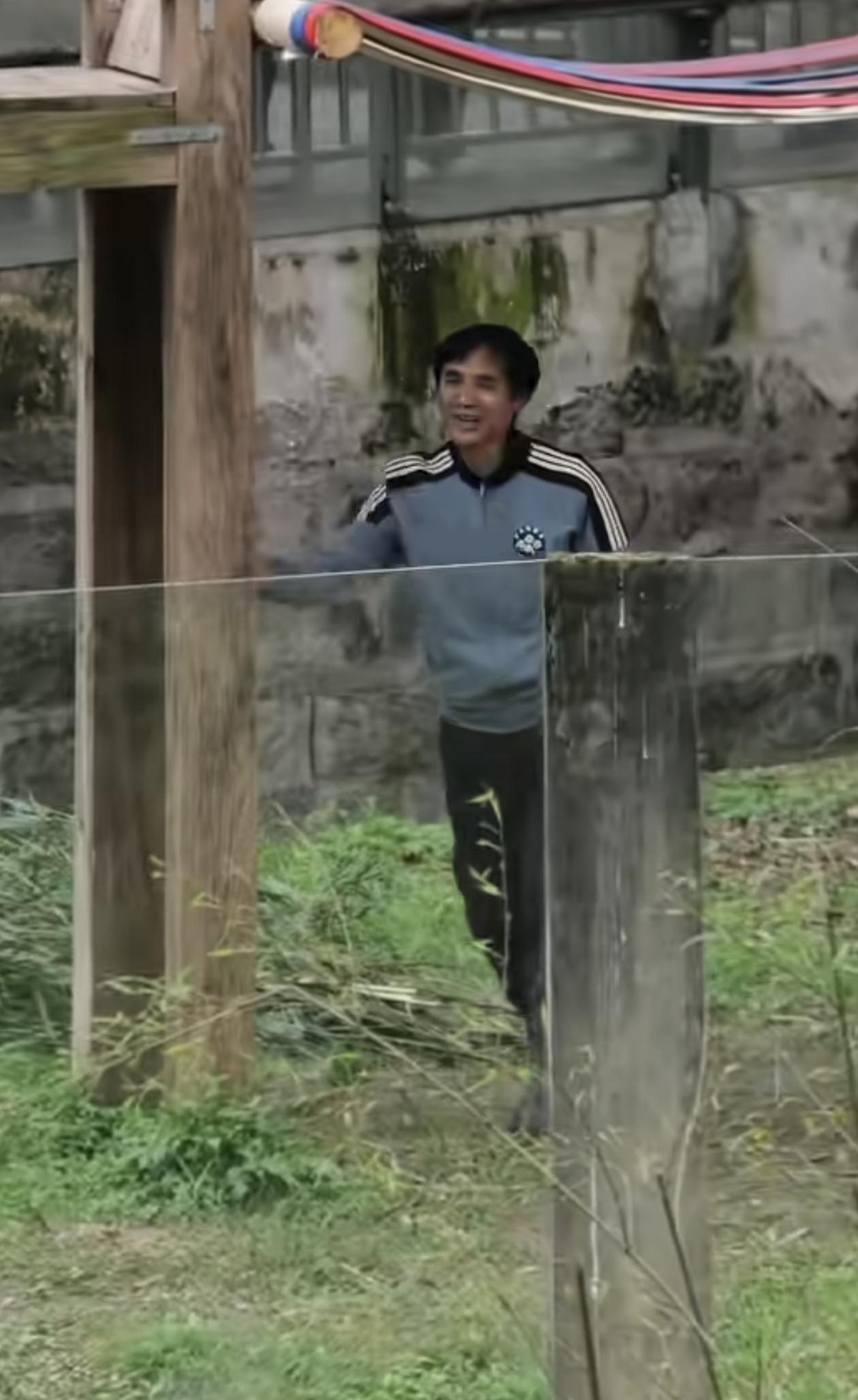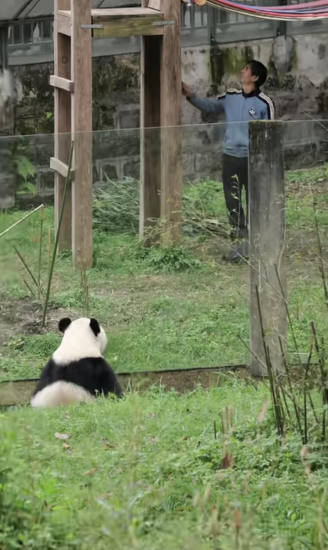 胡外公与渝爱的日常 重庆动物园的草地上,饲养员胡外公抬着头,笑着望向木架。大熊猫渝爱乖乖坐在草地上,圆滚滚的背影对着镜头,正专注地望着熟悉的外公。一人一熊隔着玻璃相望,满是温柔的默契。这治愈的日常,记录着渝爱被爱包围的幸福时光,也暖了无数牵挂它的人的心。关爱大熊猫
