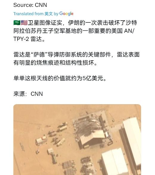 美国再次遭遇重大损失!4月3日,外媒报道称,卫星图像证实,伊朗的攻击损坏了沙特阿拉伯苏丹王子空军基地的美国AN/TPY-2雷达。而该雷达是萨德导弹防御系统的关键组成部分,图片显示,该雷达明显的炭化和结构损坏。仅雷达就价值约5亿美元。 要知道,AN/TPY-2雷达是萨德系统的核心神经,相当于整个反导体系的“眼睛”和“大脑”,负责1200公里范围内的弹道导弹预警、跟踪和拦截引导,升级后探测距离更是能达到2300公里。卫星图像显示的炭化和结构损坏,意味着雷达的30464个天线单元和核心信号处理器已彻底报废,没有了它,整套萨德系统就成了没了灵魂的空壳,即便拦截弹还在,也找不到目标。 苏丹王子基地的战略价值让这次打击的影响雪上加霜。作为美军在海湾地区的核心枢纽,这里驻扎着2300名美军,部署了KC-135加油机队、E-3G预警机等关键装备,是美军针对伊朗行动的前沿支撑点。尤其当时美军正筹备夺取伊朗哈尔克岛的行动,这座岛屿承担着伊朗90%以上的原油出口,是其经济命脉,而苏丹王子基地正是这次行动的空中加油和指挥中枢。雷达被毁直接打乱了美军的作战部署,让原本箭在弦上的进攻计划被迫搁置。 伊朗能实现精准“挖眼”,靠的是一套算计到位的非对称战术。他们没有硬碰硬对抗美军的防御体系,而是先用大量“见证者-136”自杀式无人机开路,这种单价仅2到5万美元的装备,专门用来消耗美军价值400万美元一枚的“爱国者”拦截弹。在防空系统被无人机蜂群牵制、弹药消耗殆尽后,再发射弹道导弹实施精准打击,打了美军一个措手不及。更关键的是,伊朗可能得到了俄罗斯的情报支持,卫星在袭击前三次拍摄基地,让打击目标的位置和防御弱点被摸得一清二楚。 对美国来说,更头疼的是损失难以弥补。AN/TPY-2雷达全球保有量不足20台,中东地区已经有4台被伊朗摧毁,剩下的部署在以色列和土耳其,根本无法覆盖海湾地区的防御缺口。而且修复这套雷达堪称难上加难,它需要镓、钕、镝等7种关键稀土元素,而美军82%的高端武器核心部件都依赖中国供应的稀土,现在这些材料还要和F-35战机、战斧导弹等项目争夺,修复周期长达5到8年,重建成本更是飙升到11亿美元。即便想从其他地区调运补充,美军也面临全球反导资产捉襟见肘的困境,从韩国紧急调运的萨德系统,短期内根本无法形成战斗力。 这次打击直接撕开了美军中东反导网络的大口子。原本美军在中东构建了以以色列、沙特、土耳其为节点的预警拦截闭环,AN/TPY-2雷达就是这个网络的关键节点。现在多台核心雷达被毁,美军对伊朗导弹的预警时间从15到20分钟骤降至3分钟甚至更短,部分区域完全失去预警能力。更致命的是,伊朗还拥有“法塔赫-2”这类末端速度达13到15马赫的高超音速导弹,能进行大气层内机动,原本依赖固定轨迹预测的萨德系统拦截率就不足30%,现在没了雷达支持,防御能力更是形同虚设。 美军的防御漏洞在这次打击中暴露无遗。长期以来习惯扮演“攻方”的美军,对基地防御重视不足,雷达和战机都露天停放,缺乏加固掩体,面对精准打击时毫无招架之力。而且“爱国者”系统原本针对中高空弹道导弹设计,对超低空飞行的无人机存在探测盲区,正好被伊朗的战术精准利用。开战仅8天,美军就消耗了价值12亿美元的拦截弹,相当于耗尽3年库存,这种成本不对等的消耗战,让美军陷入越防越被动的局面。 这次事件本质上是伊朗对美军中东霸权的一次精准反击。通过打击关键节点瘫痪整个体系,用低成本武器消耗高价防御系统,伊朗用最小的代价达成了最大的战略效果。美军不仅损失了昂贵装备和战略支点,更暴露了其全球部署的供应链脆弱性和防御体系的固有缺陷。未来很长一段时间里,美军在海湾地区的行动都会受到这次“挖眼”打击的影响,中东的军事平衡也因此发生了微妙而深刻的变化。