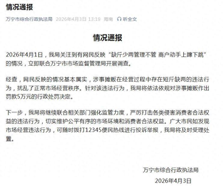 有网民反映,海南万宁一个摊贩,不仅缺斤少两,被投诉后还上蹿下跳,态度嚣张。 官方通报来了:基本属实,涉事摊贩被罚5万。 网友说,缺斤少两本来就不对,还动手?罚5万不冤。也有人担心,5万块对一个小摊贩来说不是小数目,但要是罚完继续坑人,怎么办? 万宁执法局说,以后发现类似问题,可以打12345举报。 这事说到底,不是5万块钱的事。是让那些想坑人的商户知道:坑人是要付出代价的。罚一次,比劝一百遍都管用。