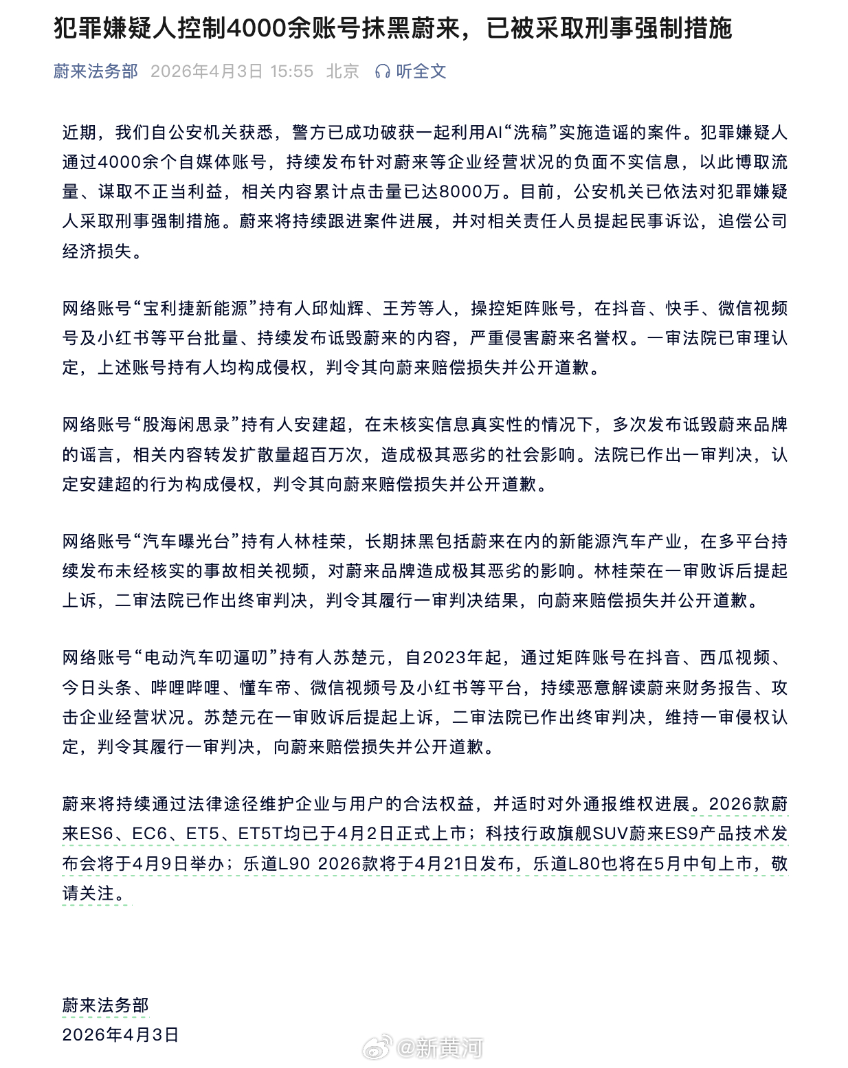 【#嫌疑人控制4000余账号抹黑蔚来# ,已被采取刑事强制措施 】据蔚来法务部:近期,我们自公安机关获悉,警方已成功破获一起利用AI“洗稿”实施造谣的案件。犯罪嫌疑人通过4000余个自媒体账号,持续发布针对蔚来等企业经营状况的负面不实信息,以此博取流量、谋取不正当利益,相关内容累计点击量已达8000万。目前,公安机关已依法对犯罪嫌疑人采取刑事强制措施。蔚来将持续跟进案件进展,并对相关责任人员提起民事诉讼,追偿公司经济损失。
