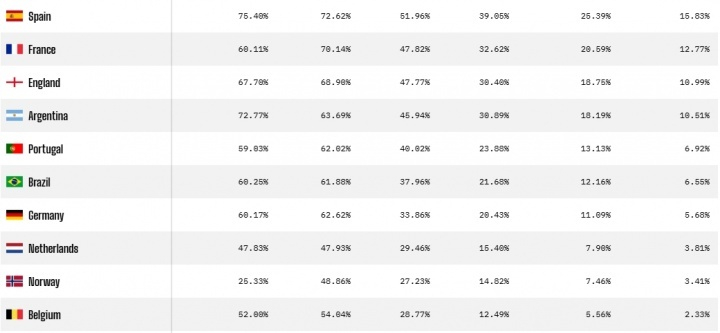 西班牙世界杯夺冠概率第一2026世界杯48支参赛队已经全部诞生,opta通过超级计算机对世界杯进行了预测,西班牙的夺冠概率为15.83%在48队中最高,卫冕冠军阿根廷10.51%排第4。