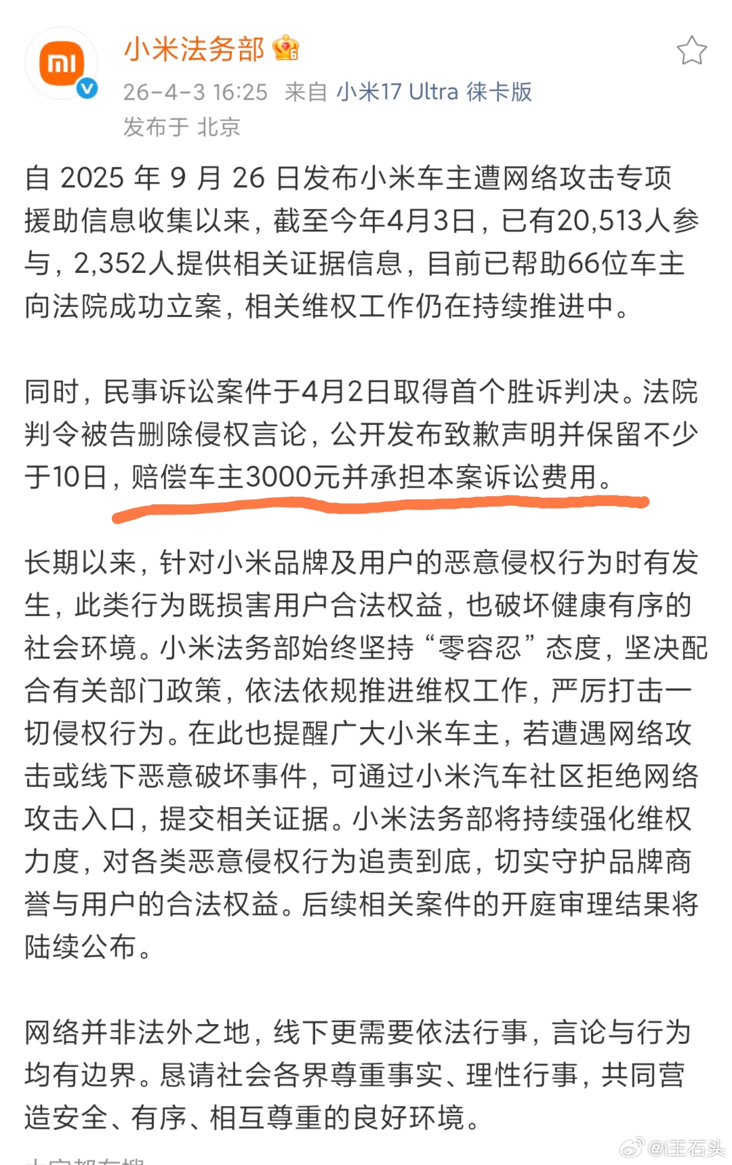 小米协助车主维权成功,法院判赔偿车主3000元并承担本案诉讼费用。其实这事儿对于小米来说是一件投入巨大的事,需要专人专项负责,耗费的精力挺大的,但实际上赔偿费用少得可怜。但为了用户,小米还是不惜投入巨大精力成本直接干,干就完事。你们还认为小米不会干的就继续呗。