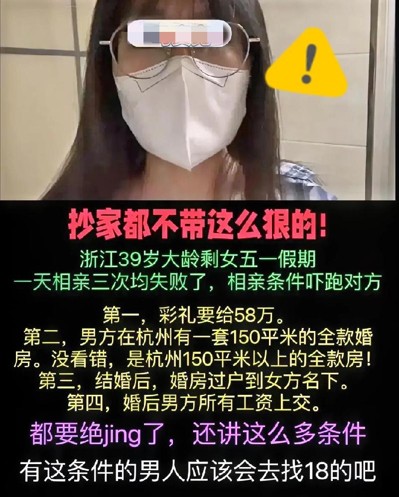 昨天刷到一个浙江39岁大姐相亲的事 真把我给看愣了 一天连着见了三个男的,结果全被吓跑了,一个都没成。 这姐们儿开出的条件,说实话有点像是在搞“资产重组”。彩礼张口就要58万,还得在杭州有一套150平的全款婚房。 最让人想不通的是,她要求房子必须过户到自己名下,往后男人的工资也得一分不剩全部上交。 我觉得这哪是相亲啊,这分明是冲着让人家“倾家荡产”去的,哪怕是去抄家,估计也就这力度了。[泪奔][泪奔] 咱说句实在话,能在杭州全款买起150平大房子的人,那都是什么阶层了?人家有这实力,凭啥找个快40岁还狮子大张口的? 现在很多女性被网上那些毒鸡汤给带歪了,总觉得自己是“小仙女”,活在真空里,完全不掂量一下现实的斤两。 39岁还没清醒过来,非要守着这些不切实际的条件不撒手,大概率只能是自个儿孤独终老了。 这事儿真不是男的太挑,是这条件实在是太离谱,谁家钱也不是大风刮来的。[捂脸][捂脸]女生相亲条件 大龄女子相亲