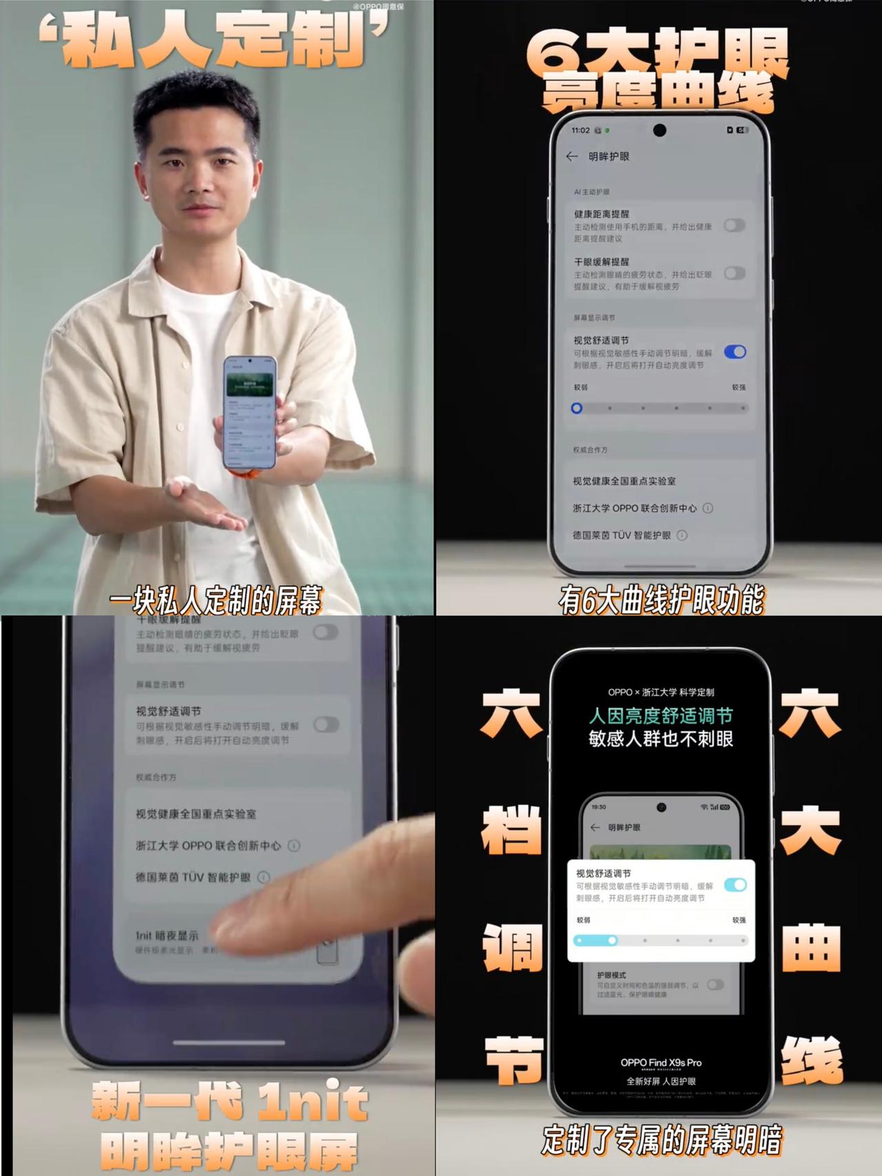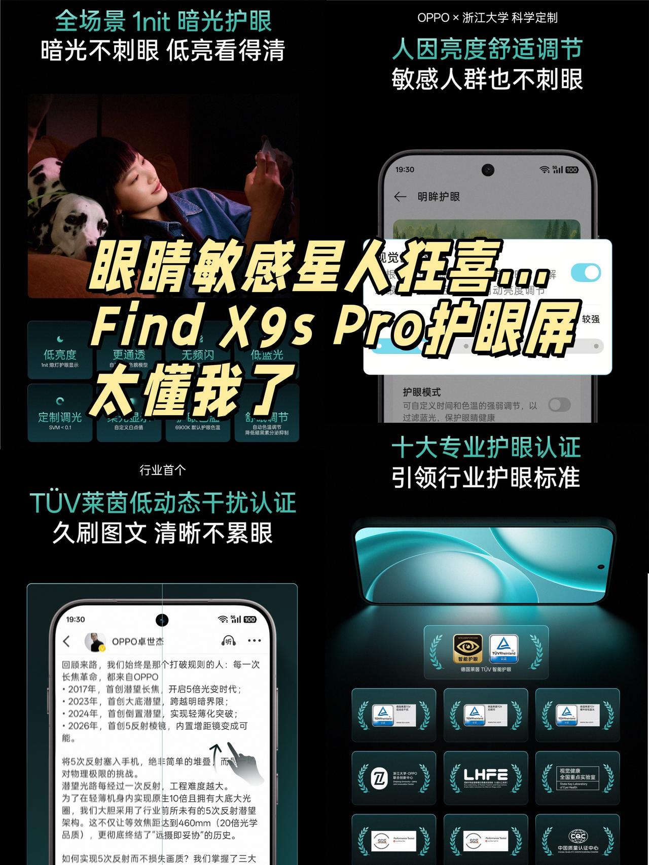 眼睛敏感星人狂喜😭新手机护眼屏太懂我了 作为眼睛敏感+重度熬夜党😭 选手机屏幕比选对象还挑! 之前用的老iPhone,晚上刷会儿就干涩流泪 白天户外又看不清,早就想换了... - 这阵子一直蹲Find X9s Pro和X9 Ultra 超爱它们的双2亿拍照 但屏幕参数没曝光前心里一直悬着,就怕踩雷… 毕竟拍照再好,屏幕看着不舒服也白搭啊😓 - 今天看到周意保发的视频,悬着的心终于放下了! 听说Find X9s Pro用上了「新一代1nit明眸护眼屏」 对咱们眼睛敏感、经常熬夜玩手机的人来说 这简直就是为我量身定做的🤩 - ✨熬夜党救星 支持3840Hz高频PWM调光+1nit全场景暗光护眼 据说在超暗的环境下(比如1nit亮度) 屏幕也超级柔和,没有刺眼频闪 还专门定制了六大护眼亮度曲线 屏幕该多亮,你的眼睛说了 我这种躺被窝里刷手机到半夜的人,终于有救了! - ☀️这块屏幕还结合了多种护眼技术, 长时间看小说、追剧,眼睛的酸涩感和疲劳感都会大大减轻 对我这种眼睛敏感的人来说,吸引力直接拉满! - 💡Find X9s Pro的屏占比也很高啊 听说这回依然是一块小直屏,四边等宽仅1.15mm 屏占比高达93.7%👍 视觉超沉浸,单手操作也轻松,手感应该也可以期待~ - 🤔眼睛敏感的姐妹懂这种被屏幕“善待”的感动吧! Find X9s Pro的屏幕直接戳中我的心巴 而且听大家都说Find X9s Pro 比X9 Pro 升级蛮明显的 会是上半年行业中zui强的Pro,媲美Ultra的级别 有没有准备蹲4.21发布会的姐妹🙋 iPhone护眼屏OPPO Find X9s Pro数码爱好者