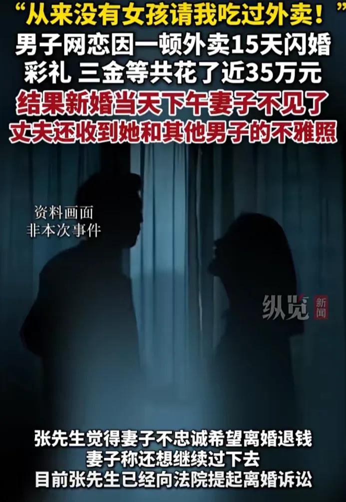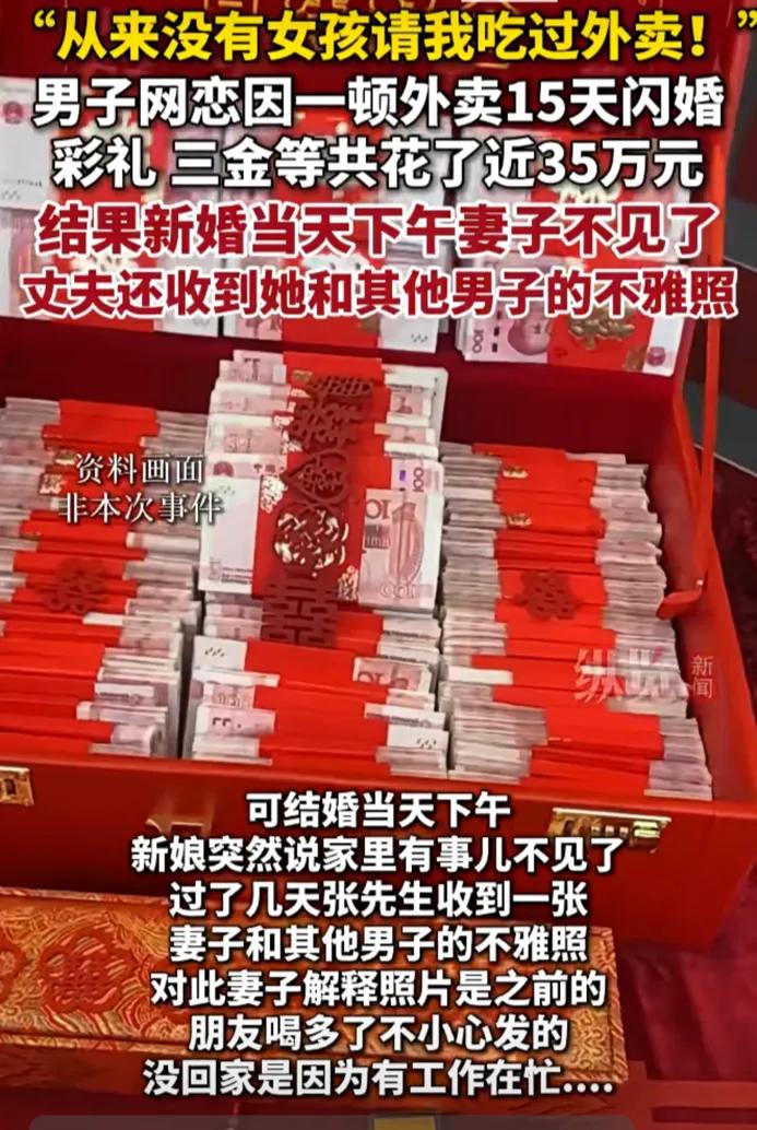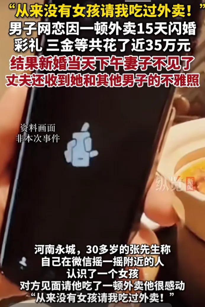 一顿外卖换35万?河南永城30多岁的张先生,怎么也没想到,自己这辈子第一次被女孩请吃外卖,换来的竟是一场精心设计的骗局。 张先生平时没怎么谈过恋爱,一次微信摇一摇,让他认识了一个女孩。两人第一次见面,女孩主动请他吃了一顿外卖,这小小的举动直接戳中了张先生的心,他逢人就说“从来没有女孩请我吃过外卖!”,就这么被这份“难得的温柔”彻底打动,彻底陷了进去。 两人的感情发展快得离谱,3天就见了家长,认识才半个月,就火速领了结婚证。为了这场闪婚,张先生掏空了家底,彩礼18.8万,再加上三金、酒席等各项开销,前前后后一共花了近35万。他满心欢喜地以为自己终于找到了幸福,等着和妻子好好过日子。 可谁能想到,婚礼当天下午,新娘就以家里有事为由,彻底消失了。张先生联系不上人,急得团团转,没过几天,更离谱的事发生了——他收到了妻子和其他男子的不雅照。 他拿着照片质问妻子,对方的解释更是离谱:照片是之前的,朋友喝多了不小心发的,没回家是因为工作忙,还说自己想继续和张先生好好过日子。 这话鬼都不信。张先生彻底清醒,明白自己从一开始就掉进了圈套。所谓的一见钟情、温柔体贴,全是骗彩礼的幌子。他当即提出离婚,要求女方退还所有花费,见对方毫无诚意,直接向法院提起了离婚诉讼。 这件事在网上炸了锅,网友们的评论一针见血:这哪是谈恋爱,分明是职业骗婚。一顿外卖就把人拿捏得死死的,15天闪婚骗走35万,新婚当天就跑路,连不雅照都能当成“意外”甩锅,这套路一套接一套,防不胜防。 也有不少人感慨,张先生的遭遇太让人心疼。一把年纪没被人好好爱过,就因为一顿外卖的温暖,掏心掏肺花光积蓄,最后落得人财两空,还被戴了绿帽子,换谁都受不了。 更值得警惕的是,这种以闪婚为幌子的骗婚案越来越多。骗子专挑那些渴望感情、社会经验少的男性下手,用小恩小惠换取信任,再以结婚为由索要高额彩礼,得手后立刻消失,最后要么玩消失,要么用各种借口搪塞,让受害者维权难上加难。 婚姻从来不是儿戏,更不是一场速战速决的交易。不管多渴望爱情,都要守住底线,多花时间了解对方,不要被一时的温暖冲昏头脑,更不要轻易拿出大额钱财。毕竟,真正想和你过日子的人,不会刚认识就急着要彩礼,更不会新婚当天就玩消失。 各位读者你们怎么看?欢迎在评论区讨论。
