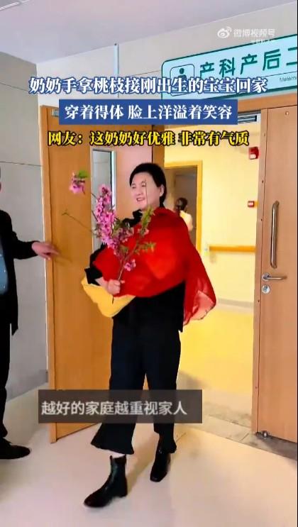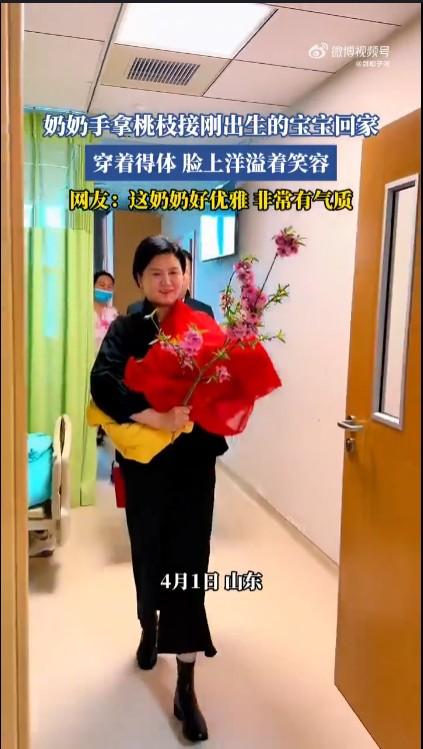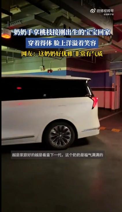 在民间传说中桃是辟邪的,所以很多地方尤其是山东习俗拿桃枝接刚出生的宝宝非常好,而且要配红布。山东这位奶奶就是这样,喜悦之情溢于言表,举止得到穿着非常有气质。但如此装扮的背后是经济实力,看看她乘坐的车就知道,如此豪华的车辆就是家庭的底气。