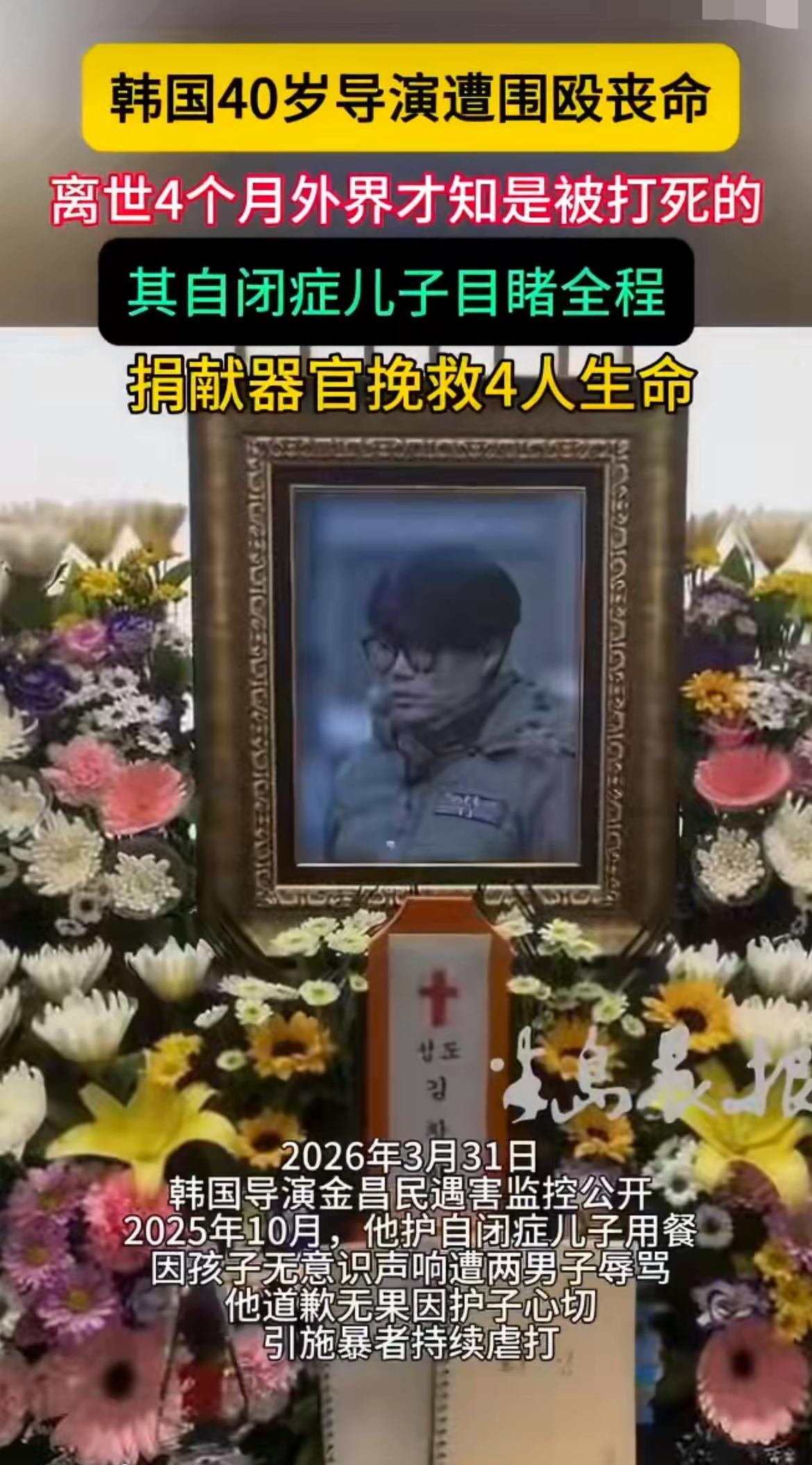 “太可恶了!”韩国导演金昌民带自闭症儿子吃宵夜,就因为孩子一点无意识声响,被邻桌俩男的辱骂后暴打致死!警方申请逮捕嫌疑人,法院竟以“住所固定、无灭证风险”驳回,凶手至今逍遥法外! 韩国40岁导演金昌民的真实死因曝光,瞬间冲上热搜,打破了此前“突发脑出血离世”的说法,引发了韩国全民的愤怒与关注。 2025年10月20日凌晨,金昌民导演带着患有自闭症的儿子外出吃宵夜。孩子因为无意识的声响,惹来了邻桌两名20多岁男子的辱骂。 金昌民第一时间起身诚恳道歉,弯腰的姿态里满是为人父的隐忍。但他的道歉并未平息对方的怒火,反而因为护子心切,被其中一人以重拳击倒,紧接着遭到了持续的虐打。在殴打过程中,金昌民的后脑勺重重磕在地上,造成了严重的创伤。 从公开的监控画面可以看到,施暴者不仅持续殴打金昌民,还抢走了试图报警的店员的手机,甚至在一旁发出大笑,而金昌民患有自闭症的儿子,就眼睁睁地看着父亲在自己面前被痛殴,这骇人的画面曝光后,引爆了众怒。 让人痛心的是,由于急救调度和沟通环节出现严重失误,金昌民在冰冷的地板上躺了近一个小时才被送往医院。尽管医疗人员紧急抢救,但他始终无法恢复意识,最终于11月7日被判定为脑死亡。 家属依照他的遗愿,捐献了他的器官,包括心脏、肝脏、肾脏,一共拯救了四条生命,让他以另一种方式延续了生命。 当时在现场目睹整件事、患有发展障碍的儿子,至今仍不知道爸爸已经过世。律师透露他在案发后经常陷入不安情绪,甚至会突然尖叫,小小的心灵承受着巨大的创伤。而金昌民的家属,因为担心施暴者潜逃,也怕孩子受到更大的刺激,选择了隐瞒真相,这五个月他们承受着巨大的痛苦和煎熬。 警方也并非毫无行动。他们以伤害致死罪为两名嫌疑人申请了逮捕令,然而法院却以“住所固定、无销毁证据风险”为由驳回了申请。之后警方再次申请逮捕令,但依旧被驳回。两名嫌疑人至今未被拘留,仍然照常生活,毫无悔意,这让家属倍感煎熬。 金昌民在韩国电影圈也是小有名气。他2013年入行,从电影道具组做起,参与了《魔女》《嫌疑人》等多部作品的美术工作。后来他执导的短片聚焦社会边缘人,呼吁对弱势群体的理解,是业内细心且温柔的创作者。可就是这样一位善良的导演,却因为保护自闭症儿子,遭遇了如此不幸的结局。 这件事曝光后引发了韩国全民的愤怒。大家纷纷直指韩国司法体系对暴力犯罪的惩戒不力、处理拖沓,同时也揭露了社会对弱势群体的包容缺失。如果你也被这起事件触动,点赞让更多人看到;转发让更多人关注这起悲剧的后续进展!可爱多一点,干爽多一点 大众9X预售发布 来源:新浪热点