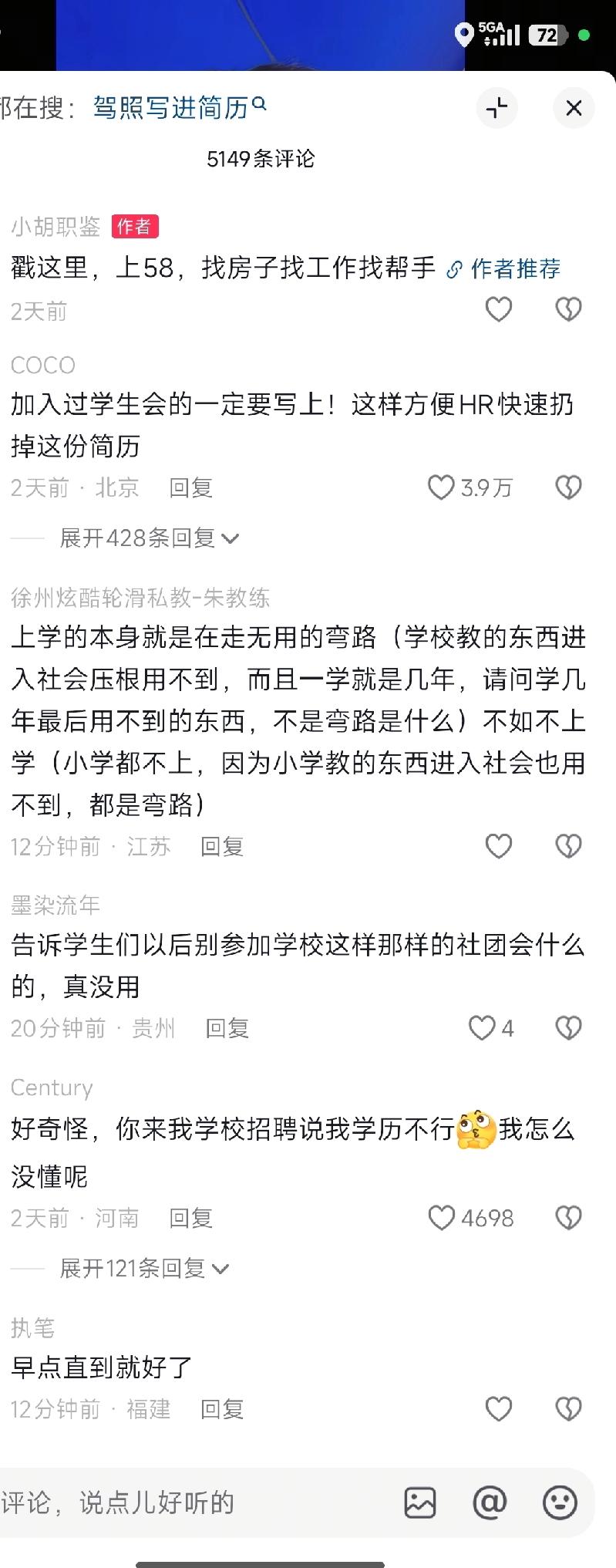 “你的简历没有匹配经验”:00后求职被拒,HR的扎心点评看哭多少人? 看了一下校招双选会求职视频一段对话,真的直击痛点: HR:不好意思啊,我看了一下你的简历,不太合适。 00后求职者:呃,那个……我问一下,就是我哪些地方不合适啊? HR:嗯,首先的话,学历。然后其次,是你的能力。因为简历上没有看到你太多跟工作匹配的这种经验啊。 00后求职者:冒昧的问一下,就是你们要招几个人?大概收了多少简历? HR:我们这个岗位的话,计划是今天招两个人,但现在已经收了快两三百份简历了。两三百。 00求职者:那小姐姐,我想再请教一下啊,就是我这个简历,它到底哪里有问题啊? HR:我看你也挺有礼貌的,那我就快速给你说一下啊。首先的话,简历上不光要标注到你的学历。其次呢,就是我们刚刚说到的能力。因为你看看你的简历上面,全写的什么?在学校里面参加的学生会呀、社团啊。其实你写这个,我们根本就呃不关心,没什么用。你还不如写个驾照有用,驾照都比这个有用啊。 求职者:啊?对,因为这些确实没有什么含金量啊。 HR:那我们主要呢,也就是看你的经验上面有没有跟工作有关的一些东西。包括呢,你可能写什么比赛呀,一些实习经历啊。再其次的话,一些什么相关的证书啊,是吧?然后还有一些技能、奖学金。这些如果说你这些都没有的话,我们基本上都是不会通过的,更别说二面了。 求职者:哦,那好,谢谢了。 有网友热评: 说自己大专毕业,从离校那一刻起就没再摸过毕业证书,因为用人单位真不在乎你的学历,他们在乎的是你的工作经验和面试时候的应对。后来公司让我负责一个部门,当我亲自去招人时,才知道为啥不看学历了,因为学历真的是最没有用的东西,哪怕是刚毕业的大学生,没有任何经验也不怕,只要他面试时应对自如,一般都会给个机会。 网友给力最有用的评价