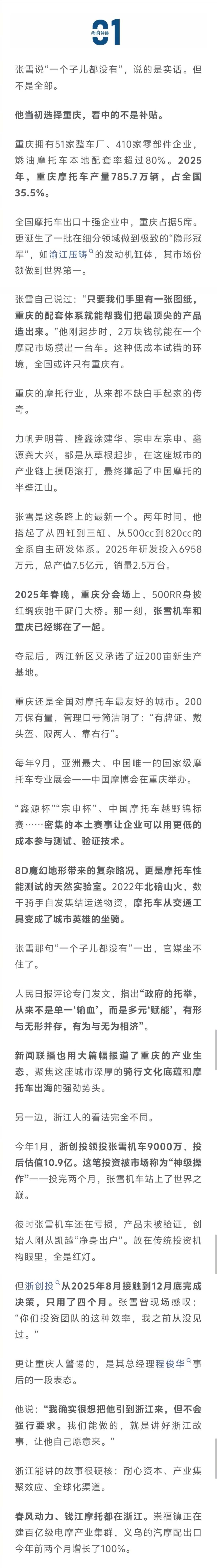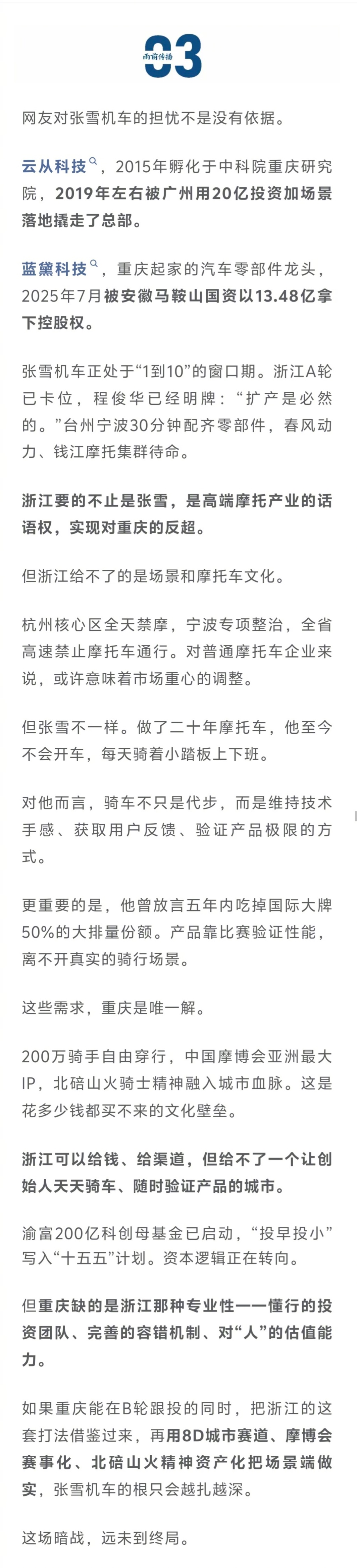 一方面,重庆以完整摩托产业链、友好骑行生态赋能张雪机车发展。 另一方面,浙江国资浙创投9000万押注张雪机车,公开表态欲引其入浙。
