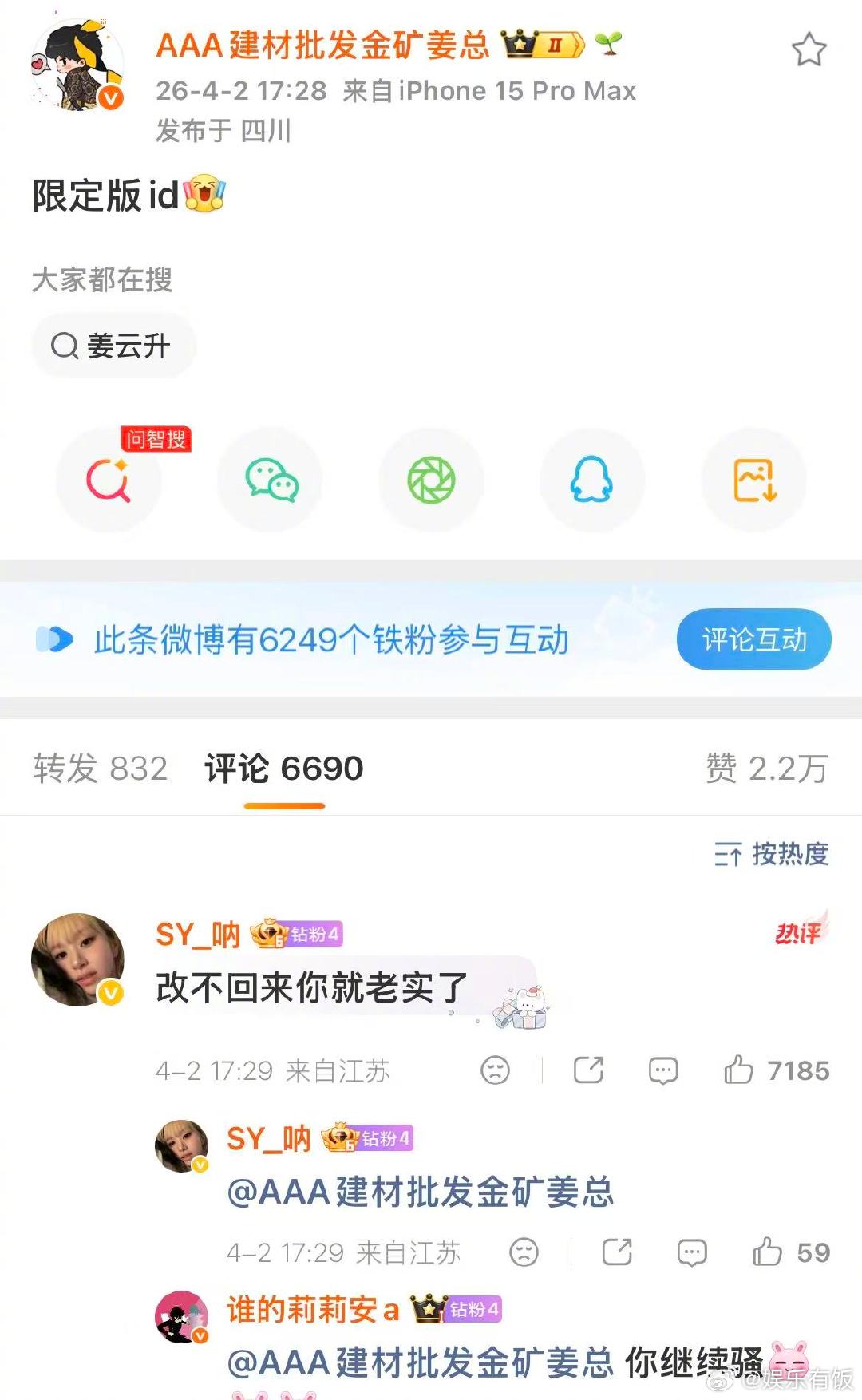 姜云升改微博ID 笑不活了,姜云升再度放飞自我,微博 ID 直接换成AAA 建材批发金矿姜总,离谱又好笑。他甚至还觉得 “AAA 专辑商演票务姜总” 这个名字更到位,粉丝直接吐槽:到时候改不回来可别后悔。