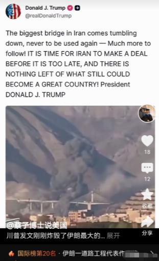 特朗普炫耀炸伊朗大桥,美国自家媒体都看不下去了! 美以联军的空袭,不仅让这座耗资4亿美元的大桥彻底损毁,还造成8名平民死亡、95人受伤。 更让人不齿的是,空袭刚结束,特朗普就迫不及待在社交平台晒出炸桥视频。他对着镜头得意洋洋宣称,这座大桥已经彻底无法使用,还放狠话称“好戏还在后头”,明摆着就是炫耀自己的“战绩”,逼伊朗赶紧低头谈判。 可能有人会问,美以好好的为什么要炸一座民生大桥。答案其实很简单,他们就是想通过摧毁伊朗的民用基础设施,切断德黑兰和北部地区的交通命脉,用这种卑劣手段施压伊朗妥协。 这座贝伊克公路桥可不是普通桥梁,它是伊朗工程界的标杆项目,原计划近期正式投入使用,承担着连接首都与里海地区的重要物流和出行功能。它的被毁,直接导致德黑兰北部交通大动脉瘫痪,民生物资运输受阻,当地民众的正常生活被彻底打乱。 更过分的是,这次空袭发生在伊朗波斯新年诺鲁孜节的尾声。当时不少附近村民正在桥边野餐庆祝,毫无防备就遭到了无差别打击。8名遇难平民里,有老人也有孩子,95名伤者中还有不少正在现场救援的医护人员。 美以联军甚至采用了双重打击的恶劣方式。第一波导弹击中桥梁后,救援队伍火速赶到现场展开搜救。紧接着,第二波空袭就接踵而至,分明是故意针对救援人员,企图彻底瓦解伊朗的应急救援能力。 以色列军方还出来打圆场,称这次打击是“战略威慑”,完全无视平民伤亡和人道主义危机。这种说辞纯属自欺欺人,一座没有任何军事用途的民生大桥,根本谈不上“战略目标”,说白了就是仗着军事实力强,肆意践踏国际法。 特朗普的炫耀操作,连美国自家媒体和专家都看不下去了。《纽约时报》直接发文批评他,说他的行为就像一个不懂事的人在危险环境里肆意妄为,完全不顾后果。 还有100多名美国国际法专家联名发表公开信,明确警告特朗普,美国对伊朗的军事打击已经违反《联合国宪章》,甚至可能构成战争罪。这些专家里,不乏来自哈佛大学、耶鲁大学等顶尖院校的学者,他们的表态足以说明问题的严重性。 美国国内的反对声浪也越来越大。民调显示,现在有66%的美国人反对对伊朗采取军事行动,其中43%的人表示强烈反对。特朗普的支持率也因此跌至36%,创下他重返白宫以来的最低水平。 大家可能不知道,这场战争的花费高得惊人。仅仅开战前12天,美国的战争开支就达到了165亿美元。白宫还急着向国会申请追加至少2000亿美元的军事开支,这些钱最终还是要美国普通民众来承担。 美国参议院民主党领袖查克·舒默也公开批评特朗普,说他的相关讲话内容散漫、逻辑混乱,根本没说清对伊朗军事行动的具体目标,还疏远了美国的盟友。就连一些共和党人,也对这种无底线升级的战争表示忧虑。 面对美以的挑衅,伊朗方面没有丝毫示弱。伊朗外交部长阿拉格齐直接发声,怒斥美以道德崩塌、士气崩溃。他明确表示,炸桥这种袭击民用设施的行为,绝对无法迫使伊朗投降,被毁的桥梁伊朗会重建得更加坚固,而美以损毁的国际信誉,永远无法修复。 伊朗革命卫队也同步表态,已经锁定美以在中东的军事和战略目标,会实施对等、精准的报复。他们还列出了美以在中东的多个交通要道作为潜在目标,一旦动手,必将让美以付出惨痛代价。 国际社会也纷纷站出来谴责美以的行为。联合国人权机构紧急发声,严厉谴责袭击非军事民用基础设施的行为,认为这违反了国际法和人道主义准则。中俄两国也呼吁美以立即停止军事冒险,避免中东局势全面失控。 现在的中东局势已经越来越紧张,美以的行为彻底突破了战争底线。他们以为炸一座大桥就能逼伊朗屈服,殊不知这种伤害平民、破坏民生的做法,只会激发伊朗上下的反抗决心,也让全世界看清了美国的霸权本质。 特朗普的炫耀,说到底就是一场政治表演。他想通过这种极端方式给自己拉选票、树形象,却忽略了战争带来的巨大代价。平民的鲜血、破碎的家园、失控的局势,这些都不是一场表演能掩盖的。 更值得警惕的是,这场冲突已经开始影响全球。国际原油价格暴涨,美国国内汽油价格突破每加仑4美元,普通美国家庭的生活压力越来越大。霍尔木兹海峡的航运安全也受到威胁,全球能源和航运风险持续攀升。 其实明眼人都能看出来,美以的如意算盘根本打不响。伊朗是一个拥有6000多年文明的国家,不会轻易被武力胁迫。特朗普的炫耀和挑衅,不仅不会让伊朗妥协,反而会让美国在中东的影响力加速衰退,最终只会引火烧身。