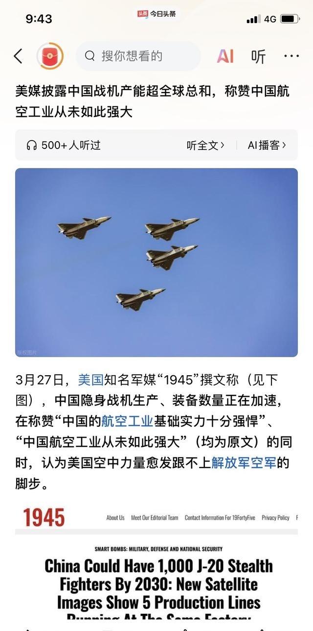 首次直接认怂!美国军方媒体直接发文表示,中国隐形战斗机数量会超过所有国家总和;美国空中力量已经跟不上解放军的脚步。最新消息:美国知名军媒“1945”撰文称(见下图),中国隐身战机生产、装备数量正在加速,在称赞“中国的航空工业基础实力十分强悍”、“中国航空工业从未如此强大”(均为原文)的同时,认为美国空中力量跟不上解放军空军的脚步。 文章说中国现在一年能造100到120架歼-20,生产线满负荷运转,零部件从仓库出来就直接进总装区,效率高到让美方分析员直呼没想到。歼-20已经装备部队超过300架,有的估算接近400架,未来几年还会继续增加,到2030年前后可能接近1000架,这数字已经超过全球其他国家所有隐身战机加起来的总量。 报道里还提到了歼-35的情况,这款中型隐身舰载机也在沈阳等地加速组装,年产量正从几十架往上爬,预计很快能稳定在60到70架左右。加上歼-20的产能,中国先进战机一年总产量能到300到400架,等于把美国、俄罗斯、欧洲那些主要国家的战机年产全加起来还多。美方智库米切尔航空航天研究所的报告也支持这个说法,他们看卫星图发现成飞和沈飞都在扩建新产线,脉动生产线一条接一条,自动化设备配合工人操作,隐身涂层和发动机安装环节都实现了自主掌握。 美国那边F-22早就停产,F-35虽然还在造,但一年最多156架左右,还常有质量和技术问题拖后腿。相比之下,中国航空工业从材料到总装全链条都自己把控,成本控制得好,交付速度快,这让解放军空军在装备更新上拉开了距离。报道强调中国空军现在积极推进空天一体和攻防兼备的布局,作战半径和能力都在拓展,而美国全球部署分散了资源,在关键技术迭代上显得力不从心。 文章语气里透着一种意外,因为美国军方媒体过去很少这么直白承认差距,这次直接点明中国航空工业基础扎实,从基础研究到制造每个步骤都跟得上需求。歼-20改进型已经在部队里进行训练,歼-35也为海军远海行动提供支持,这些装备数量的增长直接体现在日常巡逻和演训里。美方分析认为,如果产能保持这个势头,中国隐身战机现役总数很快就会领先全球,这对空中力量平衡是个实打实的改变。 当然,美国还是有自己的技术积累和科研底子,但报道里没回避当前的生产现实差距。中国这边也没停步,六代机相关前期研究在实验室和试飞基地稳步推进,重点攻克高超音速和智能协同这些点,虽然具体量产时间没公布,但基础工作已经在做。整个航空工业的成果就是更多先进战机列装部队,领空安全保障能力一步步抬高。这样的发展让外界看到,中国抓住制造业优势和完整产业链,在合适时机扩展空中力量,这步棋走得扎实。 中国航空工业的强大不是空话,而是卫星图和产能数据摆在那儿。解放军空军装备序列越来越完整,从歼-20到歼-35的批量交付,让空中力量的脚步越来越稳。整个过程就是这么一步一个脚印,生产线上多一条产线,部队里就多一批战机,差距就这样慢慢拉开。美媒这次的表态,算是在公开场合把话挑明了。