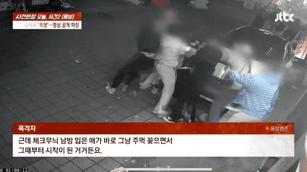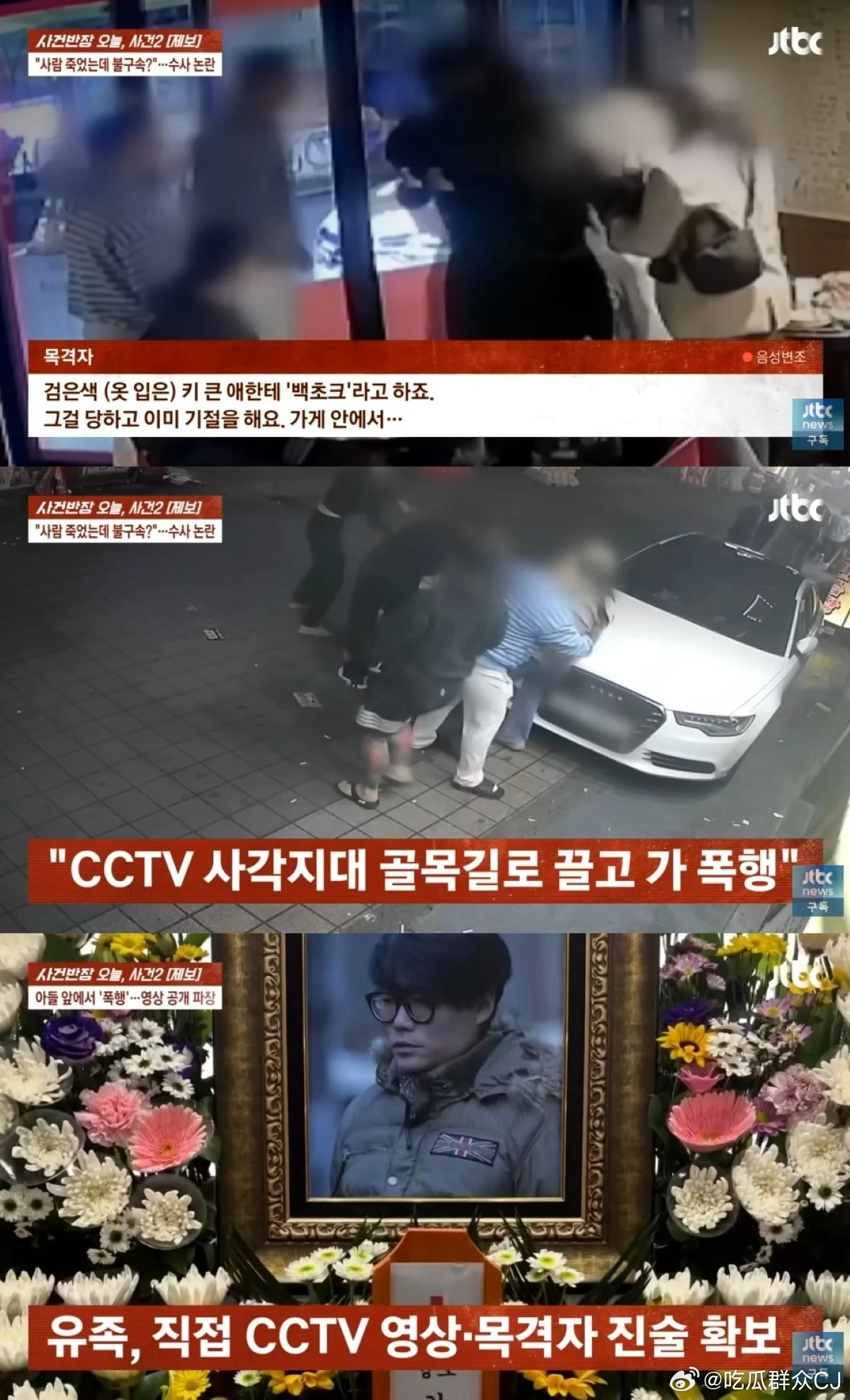 去年10月20号深夜,金昌珉带着突然想吃炸猪排的儿子去了京畿道一家24小时营业的餐厅,因为噪音问题和店内其他几名20多岁的年轻男子发生了争执。几名壮汉先是当着小孩子的面将其“锁喉”,据目击者说其实这时候金昌珉就已经短暂昏迷后,等他醒来走出店门也摊开双手请求对方住手别再打了,但又有人冲出来直接朝他一拳挥去,之后就把金昌珉按在地上拖来拖去一通暴打。看监控视频能发现,其实有几位女士一直在劝阻施暴者,试图让他们停下(P3、P4),但他们不仅没听,看着昏迷过去的金昌珉还发出了笑声。金昌珉是在报警后一小时才被送到医院,错过了黄金抢救时间,最终无力回天,生命结束于脑出血导致的脑死亡。