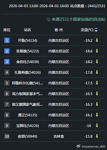 今天因为冷空气和雨雪遮挡光照影响,内蒙古多地到吉林西部、黑龙江南部,降温超10℃。其中内蒙古赤峰通辽下属站点,降温超15℃。内蒙古开鲁降19.2℃、奈曼旗降18.6℃、舍伯吐降18.2℃、扎鲁特旗降17.8℃、阿鲁科尔沁旗降17.5℃。排在14时降温前五。此外,哈尔滨降14.3℃、长春降13℃,降温也很强。