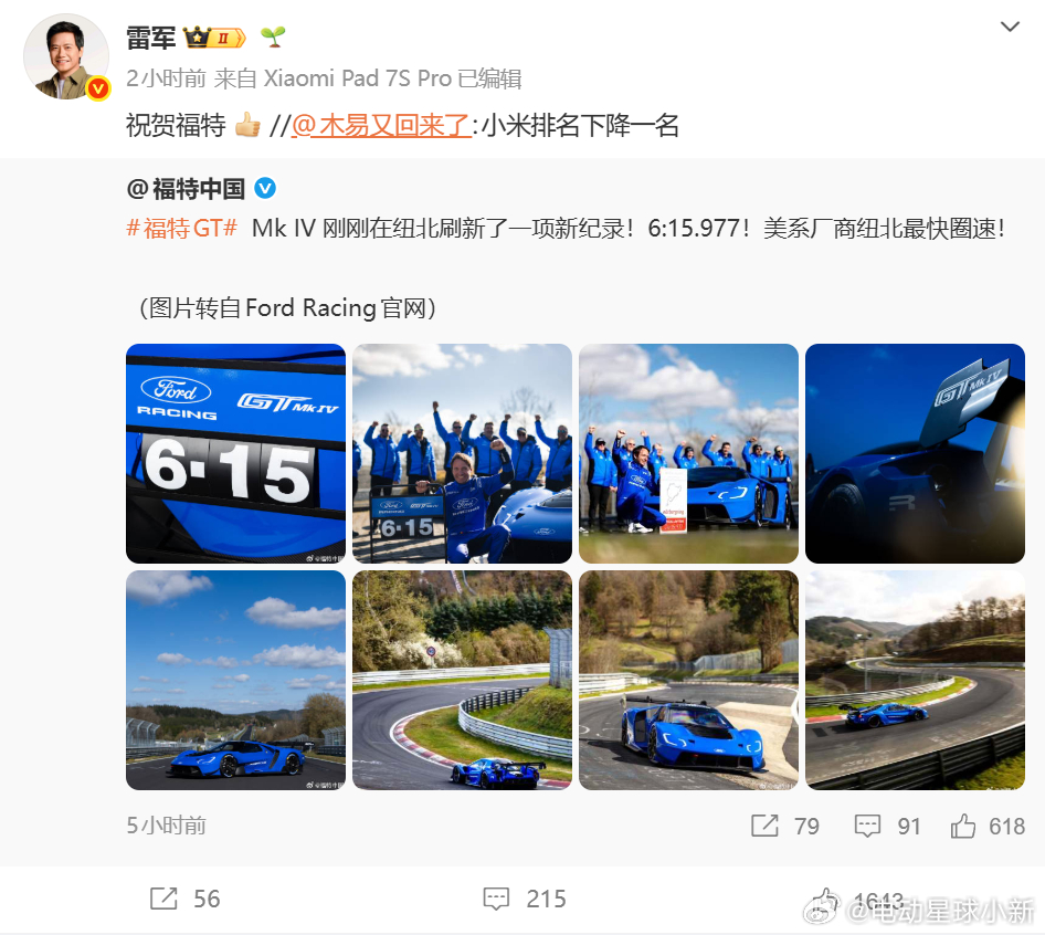 雷军祝贺福特纽北成绩雷军祝福福特