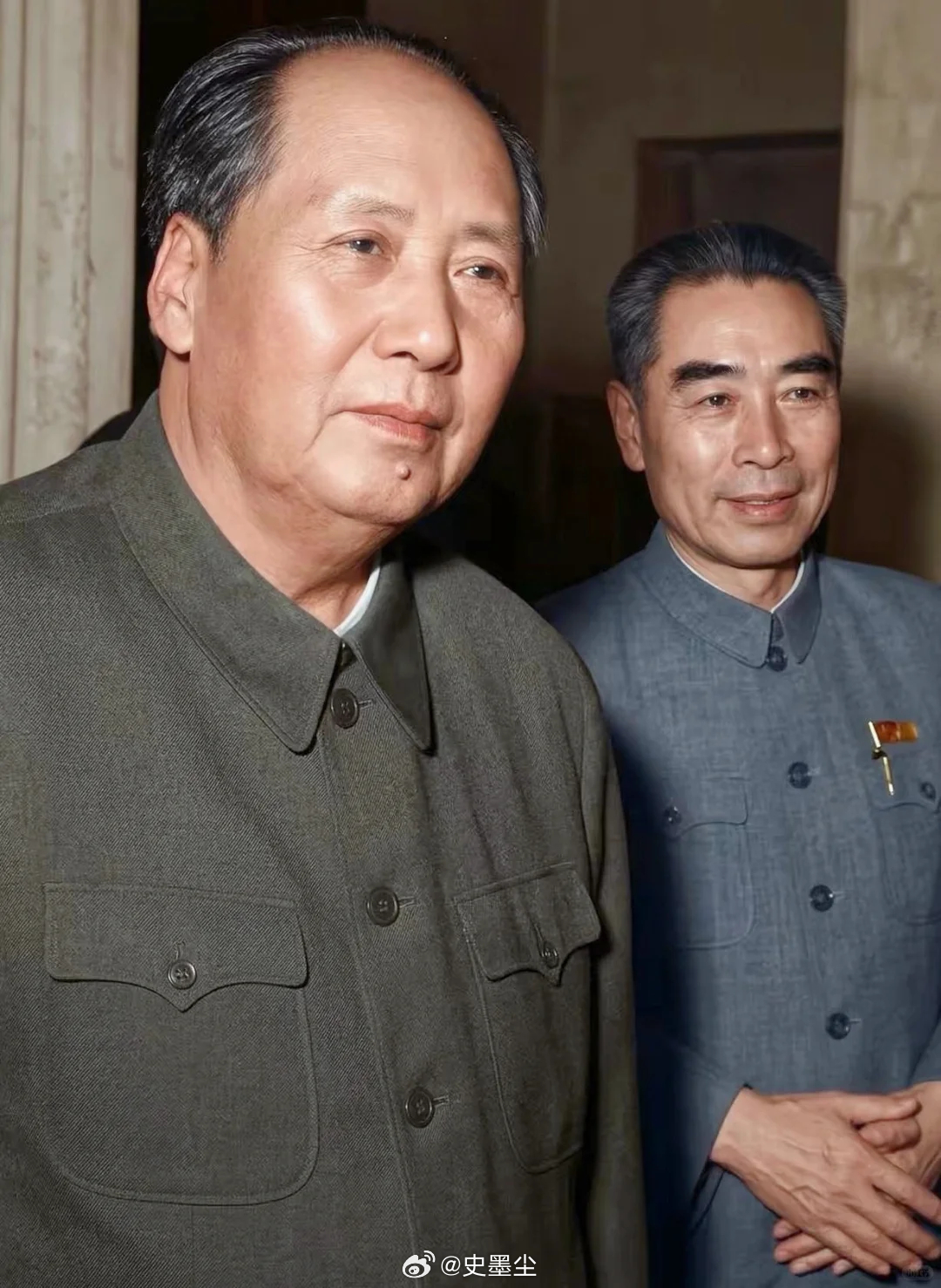 画面里,毛主席与周总理并肩而立,会见外宾。毛主席的目光深邃如海,从容不迫,嘴角似带一丝洞悉风云的微笑,每一个姿态都散发着气吞山河的统帅气度;周总理则身姿清癯挺拔,目光专注而温暖,以如沐春风的风范与来宾交谈。这不是一张普通的合影,这是新中国外交战线上最动人的“双子星”图景。一人如山,雄浑巍峨,定鼎乾坤;一人如川,温润通达,泽被万物。他们无需言语的默契,是数十年风雨同舟铸就的信任;他们举手投足间的气度,是五千年文明涵养出的自信与谦和。岁月流金,伟人已逝,但这一幅幅“毛周同心”的画面,已化为一座不朽的精神丰碑,永远矗立在中国人民与世界人民的心中。