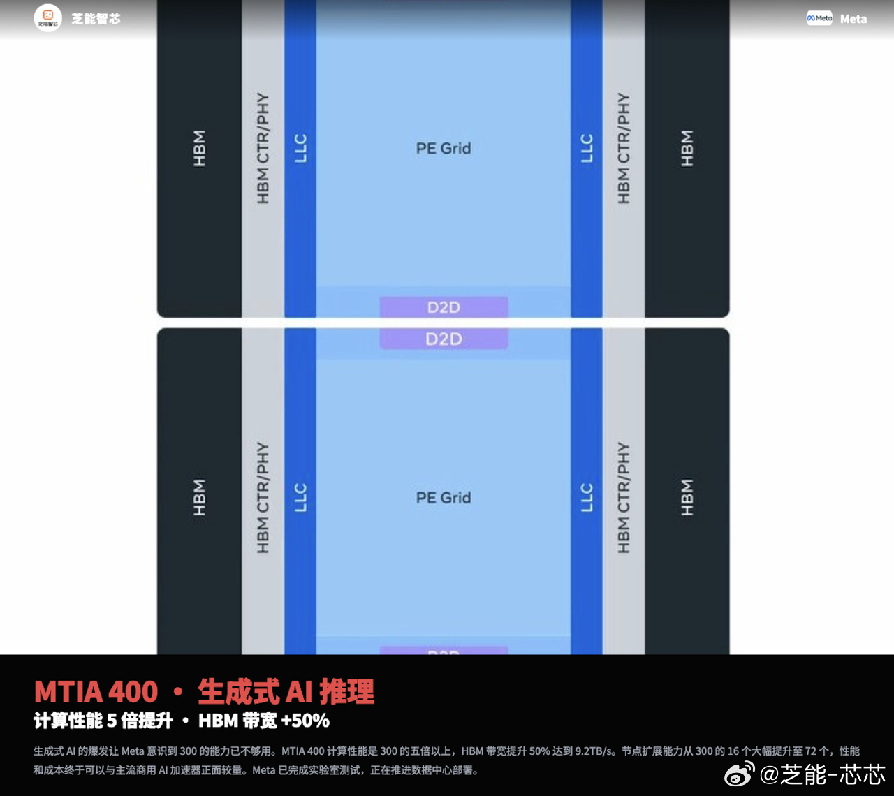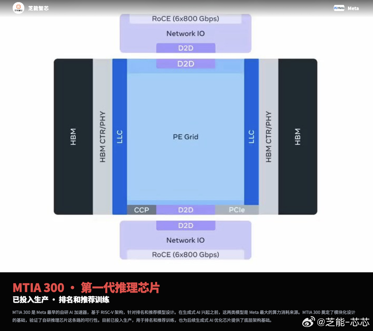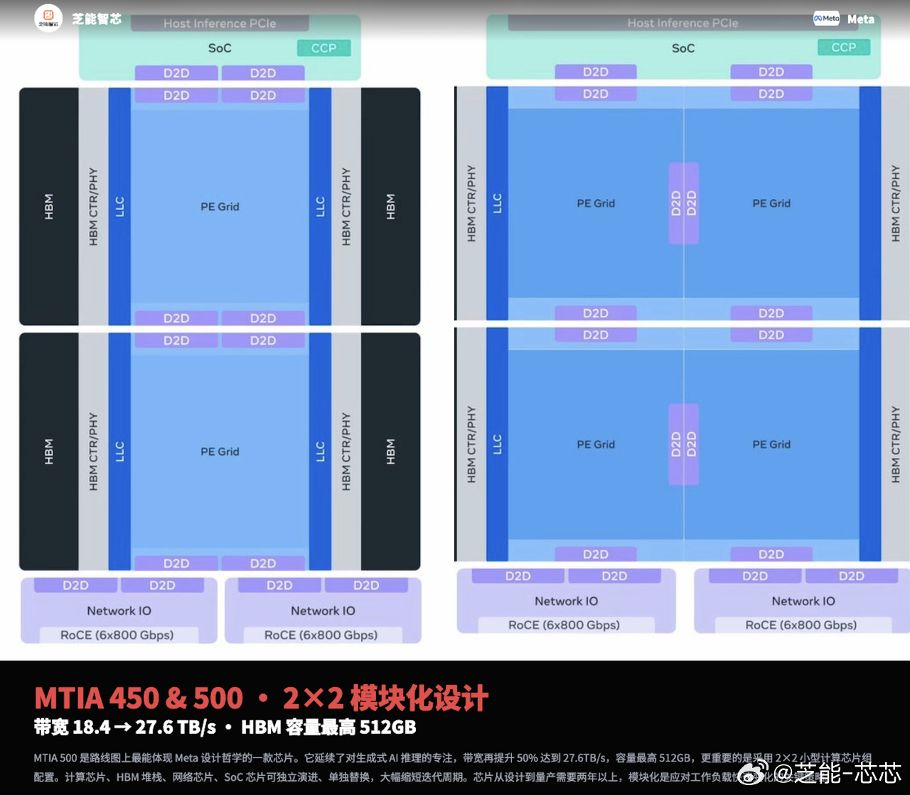 Meta 公布 MTIA 四代 AI 芯片完整路线图,聚焦推理场景,基于 RISC-V 架构打造,模块化设计实现快速迭代。MTIA 300 已量产服务推荐系统,400 完成测试适配生成式 AI,450 与 500 聚焦带宽升级与模块化封装,计划 2027 年部署。