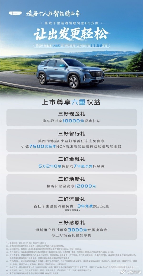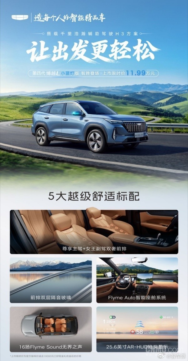 第四代博越 L 小蓝灯版上市 15 万内唯一配千里浩瀚 H3 智驾的燃油 SUV 来了!4 月 3 日,第四代博越 L 小蓝灯版正式上市,限时价仅11.99 万。搭载 3 雷达 + 11 摄像头 + 128TOPS 算力,支持高速 NOA、智能泊车;15.4 英寸 2.5K 屏 + FlymeAuto 座舱 + 25.6 英寸 AR-HUD,四音区语音拉满智能体验。动力为 1.5TD+7DCT,轴距 2785mm,还有双层隔音 + 16 扬音响。购车立减 1 万,首任车主享 5 年免费 NOA 使用权,性价比直接拉满🔥