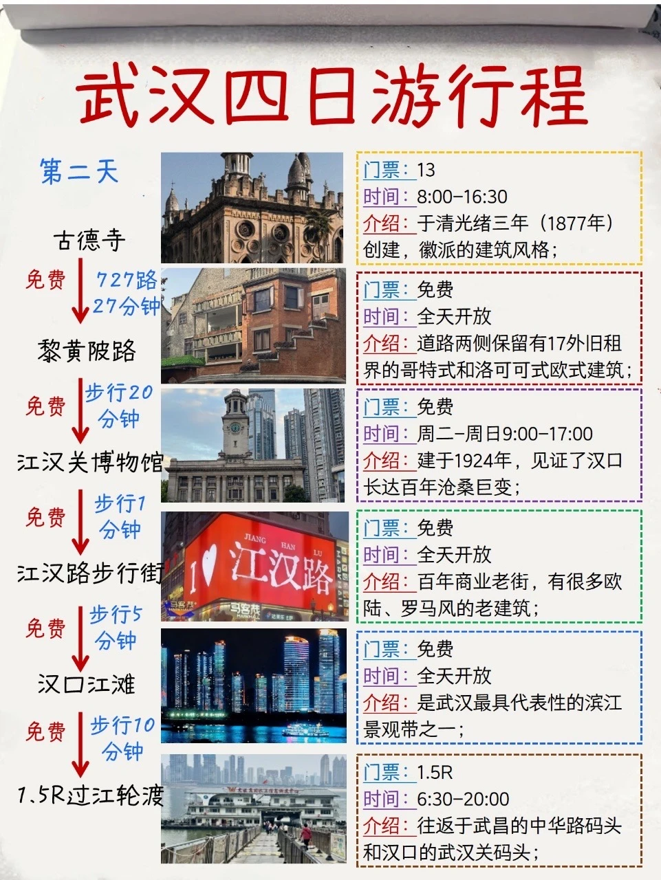第2️⃣天:古德寺——黎黄陂路——江汉关博物馆——江汉路步行街——汉口江滩——1.5R过江轮渡