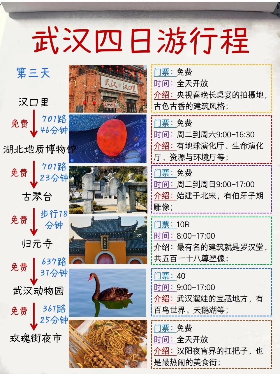 第3️⃣天:汉口里——湖北地质博物馆——古琴台——归元寺——武汉动物园——玫瑰街夜市