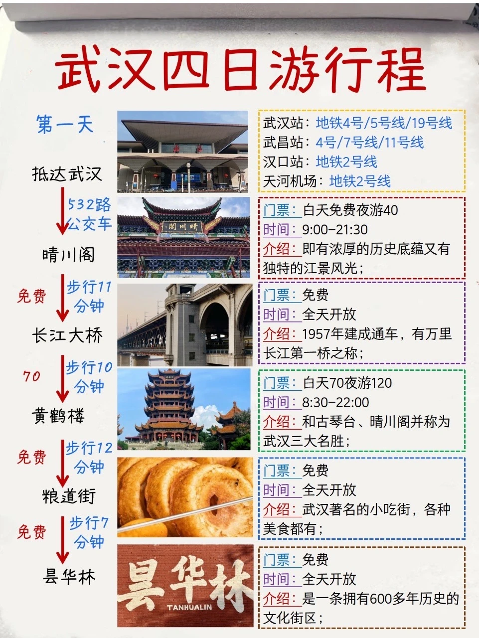 第1️⃣天:抵达武汉——入住酒店——晴川阁——长江大桥——黄鹤楼——粮道街——昙华林