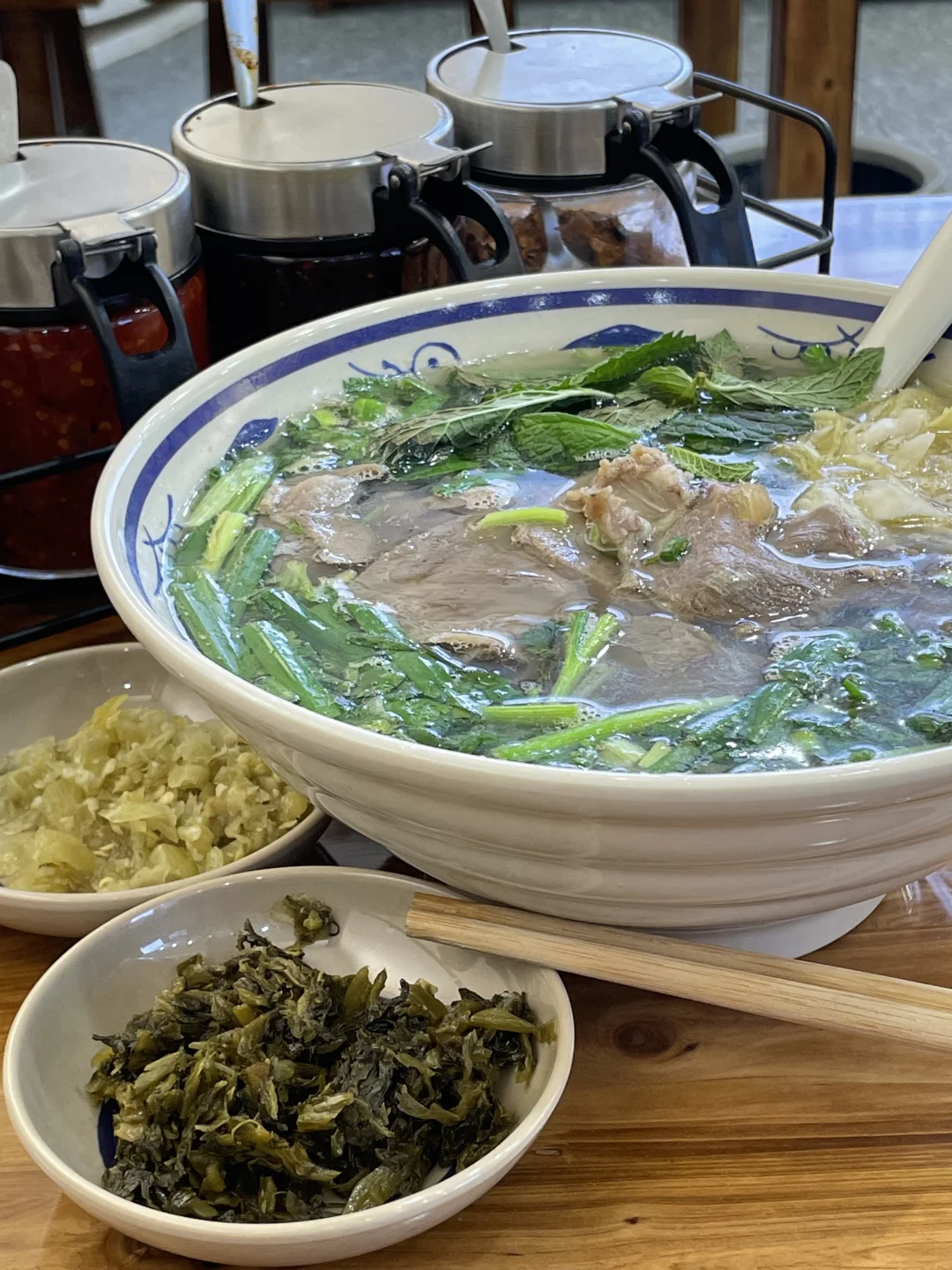 最妙的是桌上那盆糊辣椒——舀一勺撒进碗里,焦香裹着辣意瞬间苏醒。再配上酸菜和薄荷,酸爽与清凉让整碗米粉层次分明。嗦一口爽滑的粉,喝一口滚烫的汤,额头微微冒汗,浑身都暖透了。