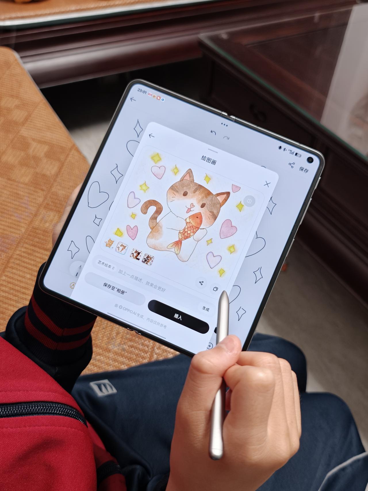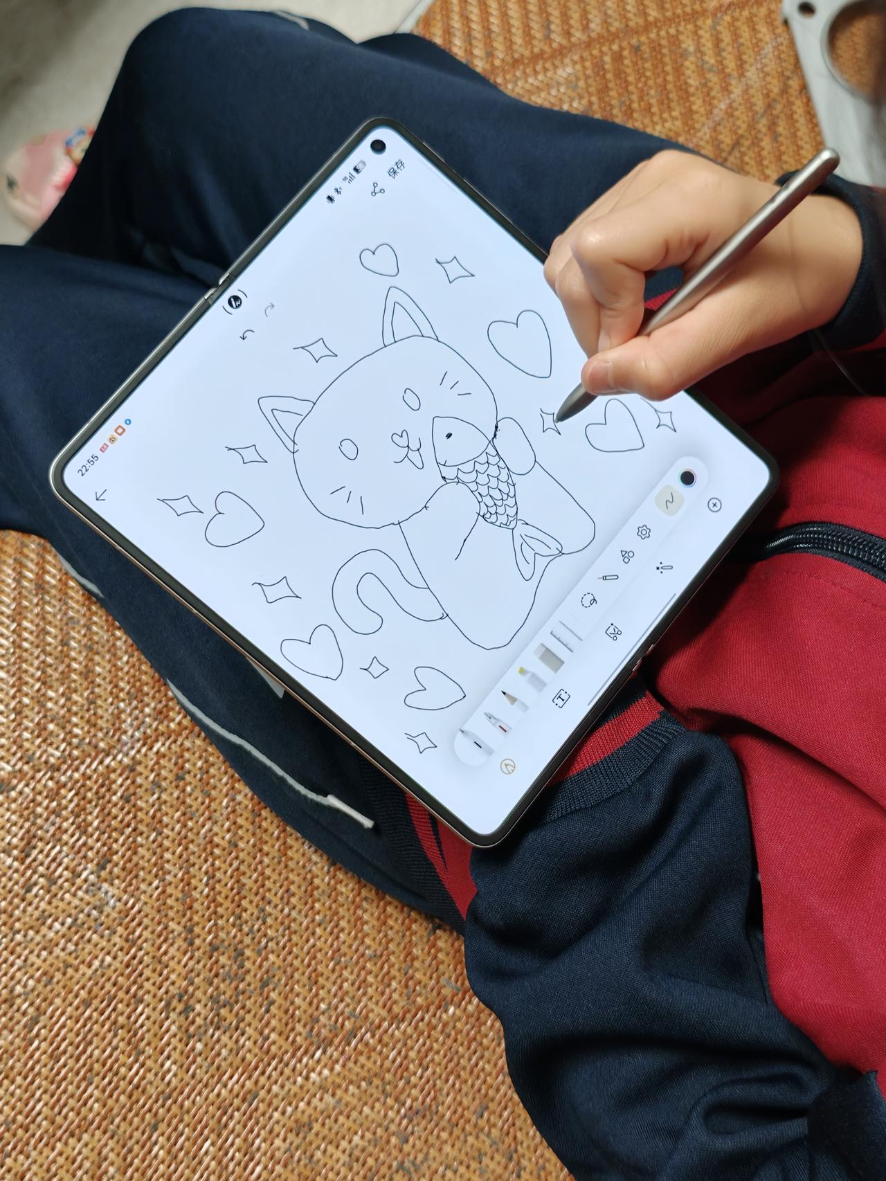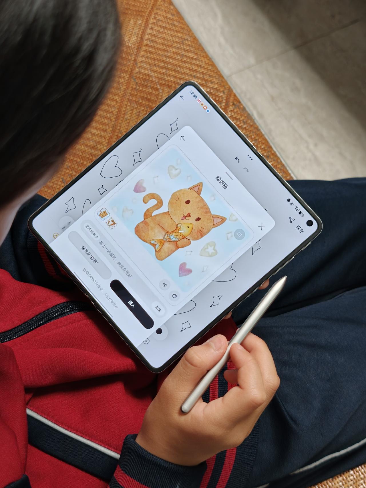 把折叠屏给小孩你就会得到... 刚买的OPPO Find N6折叠屏手机,小孩真的喜欢的不得了😂家里其实也有平板给她玩的,就非得玩我的。。。 主要她说OPPO这个AI手写笔可以自动上色,还能生成不同风格的,自己画个草图就行,比用平板画方便好多,那我也没办法了,只能顺着她咯~ 而且Find N6的内屏感觉不到折痕,笔划过去也不会有凹凸,所以她拿着就跟个小平板一样,拿在手上用还不会太重,单手托着就是画,拿着当成小平板用了 我买这款主要是想着办公能用到,有手写笔改文档、批注比较方便,没想到小孩这么喜欢,现在手机相册里存了一堆她画的图,情绪价值这一块呀~ 我的小孩 贴心小棉袄 小棉袄 OPPOFindN6 折叠屏手机 OPPO 数码科技