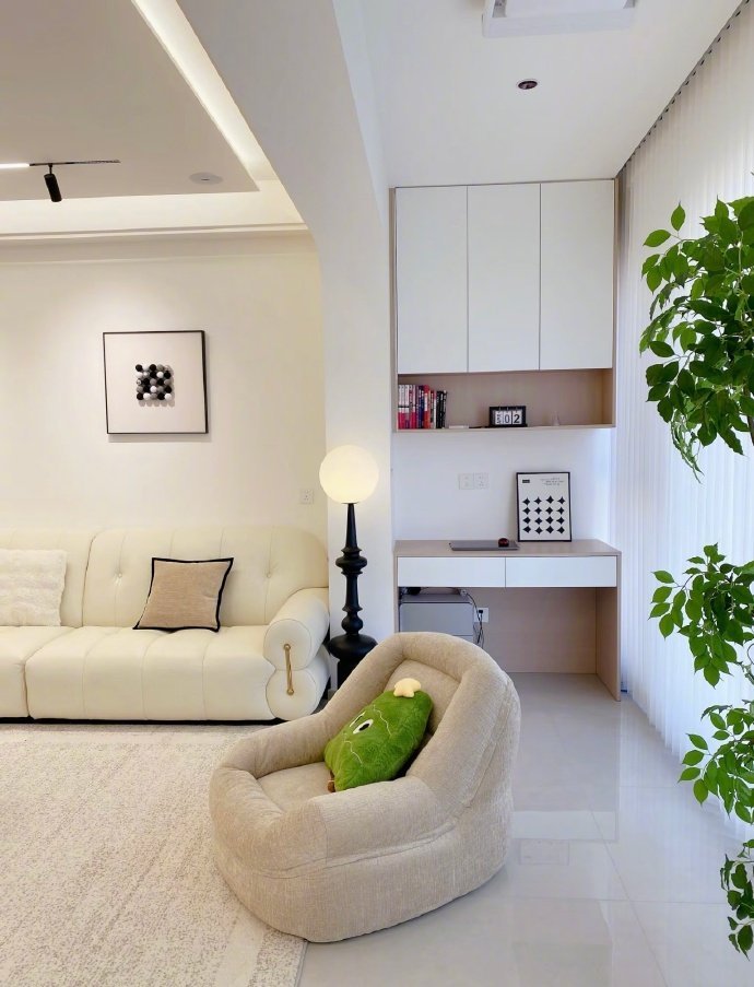 纯白色奶油风+亮面地砖,客厅地毯感觉加分很多,精装房的可以参考..