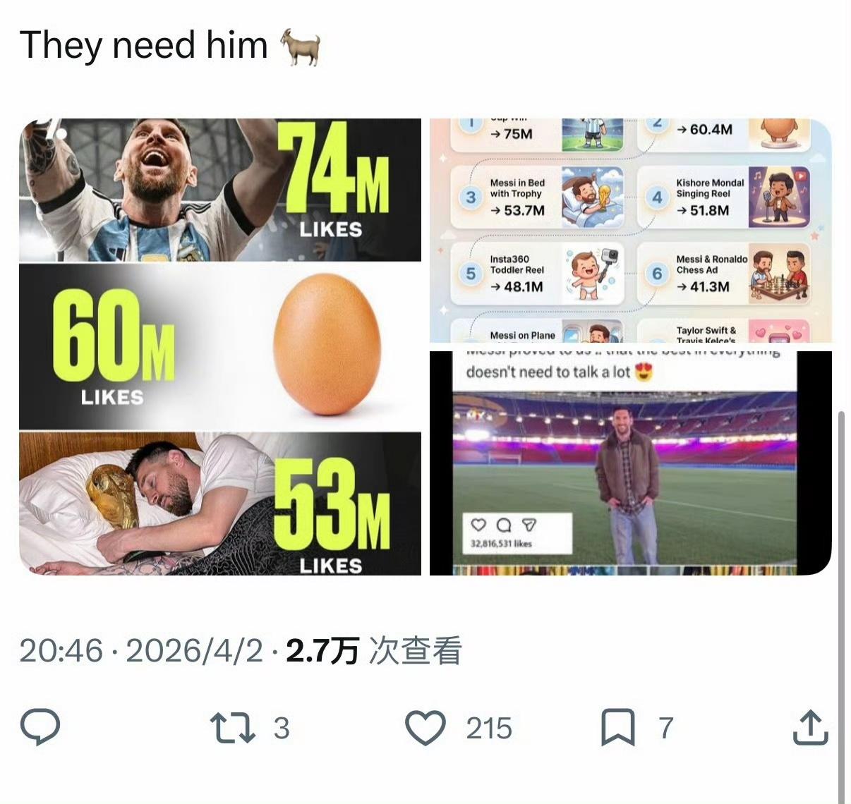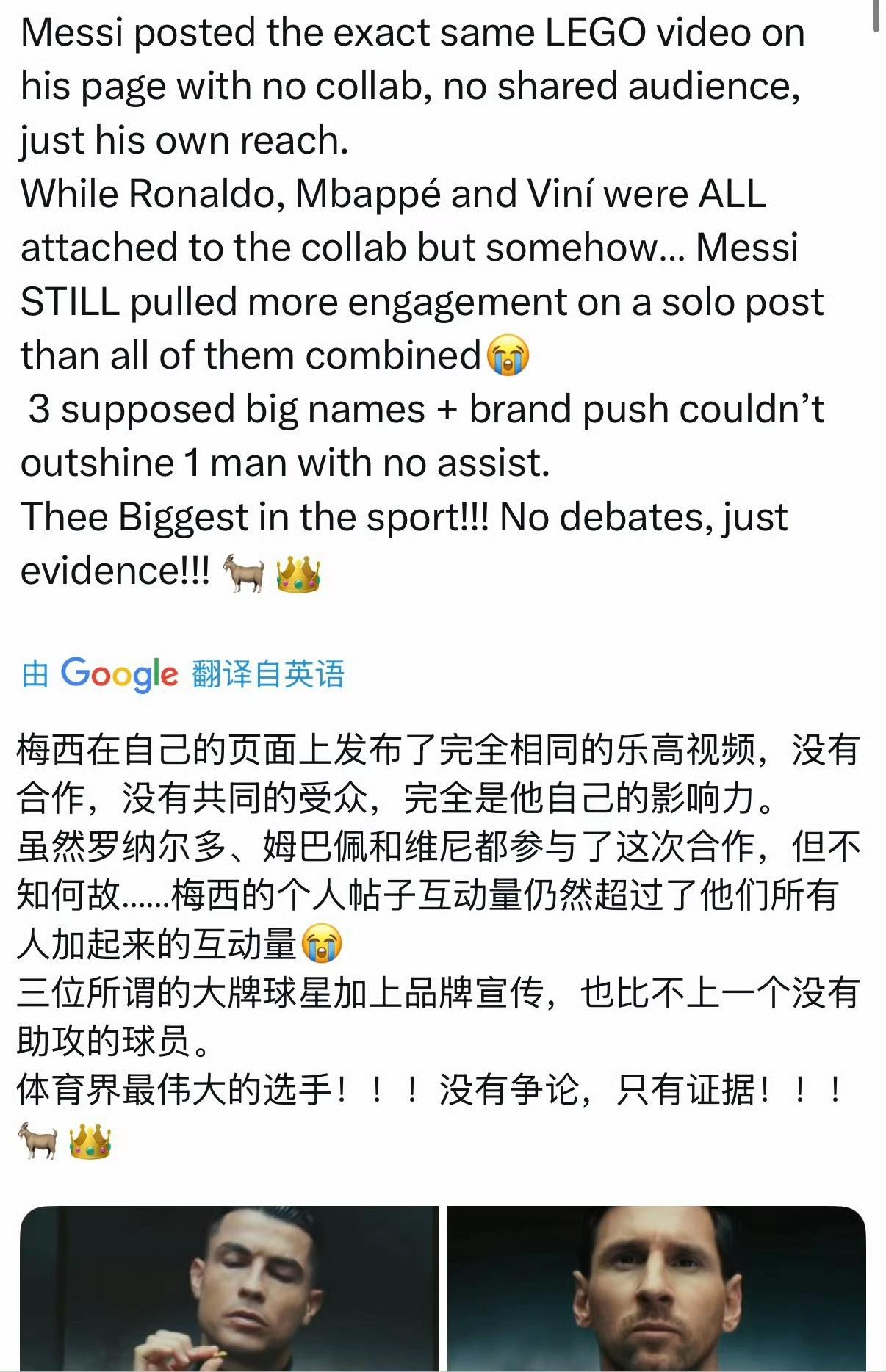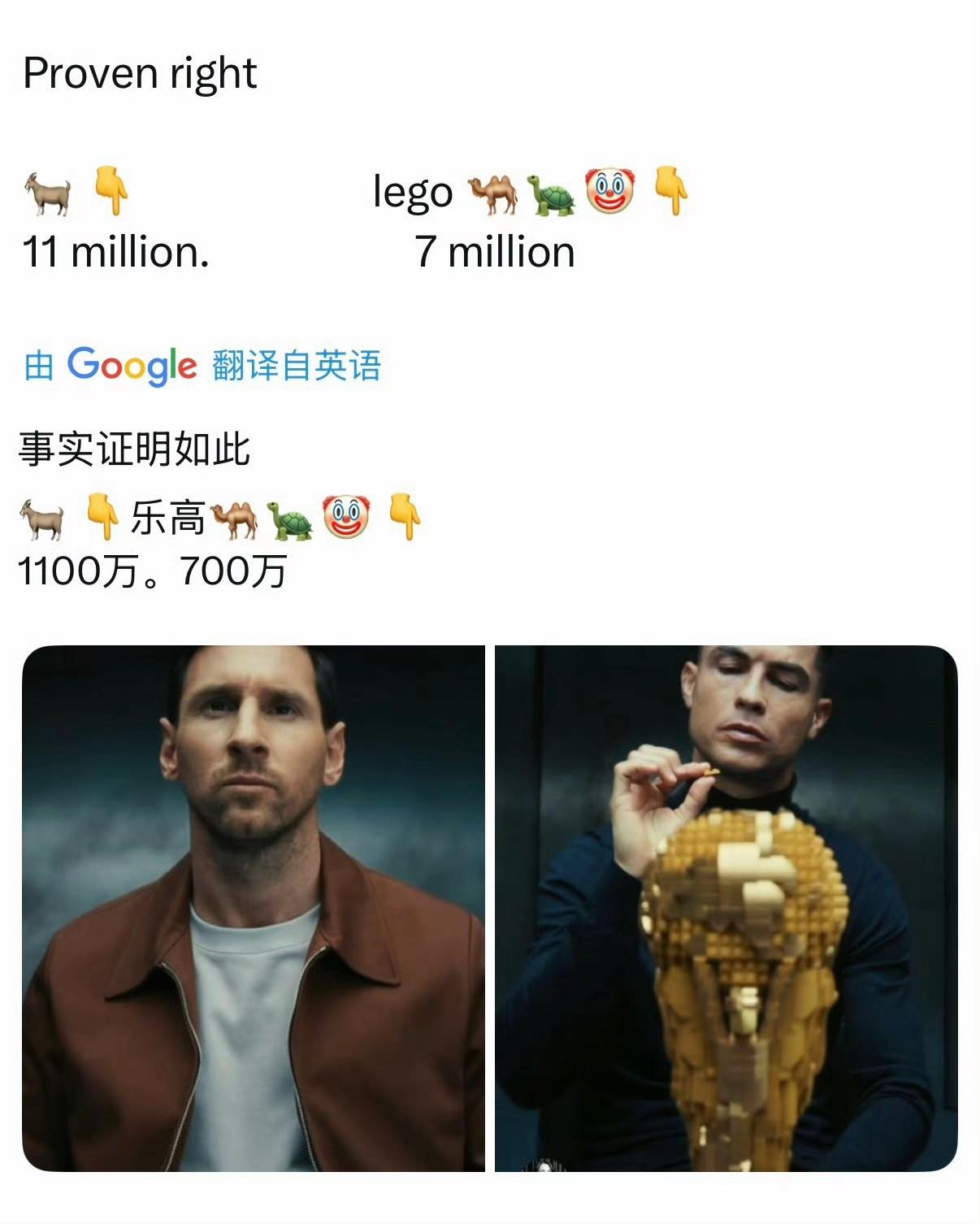 完全相同的乐高视频,梅西独自发帖,获得的赞数比他们所有人加起来都多。 C罗不是被称为油管之王吗?梅西真的又当了一回球王……