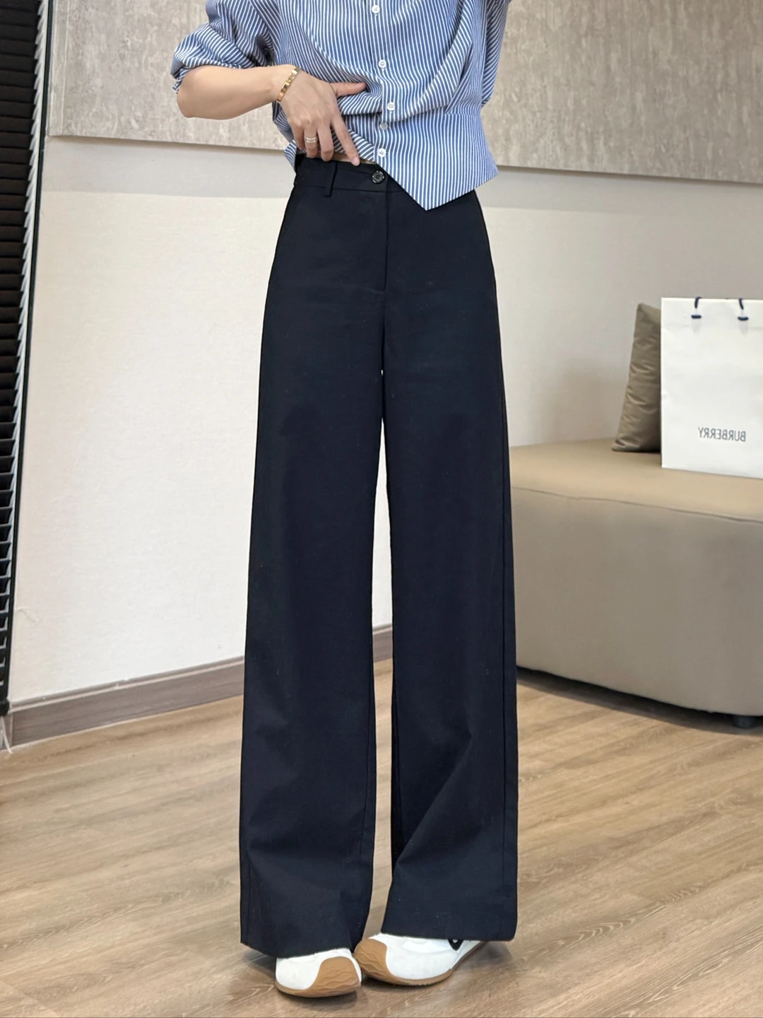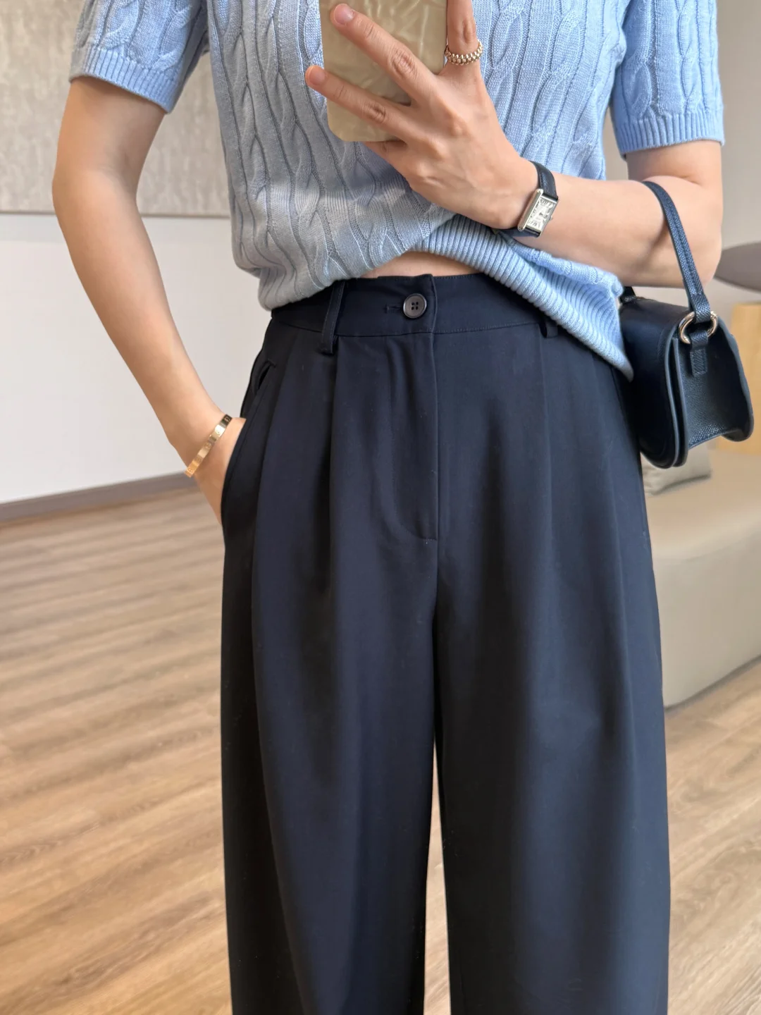 我找到了!就是这条深蓝色高腰阔腿神裤👖 垂感满分、剪裁利落 懒人、上班族、学生党都能直接抄作业👇