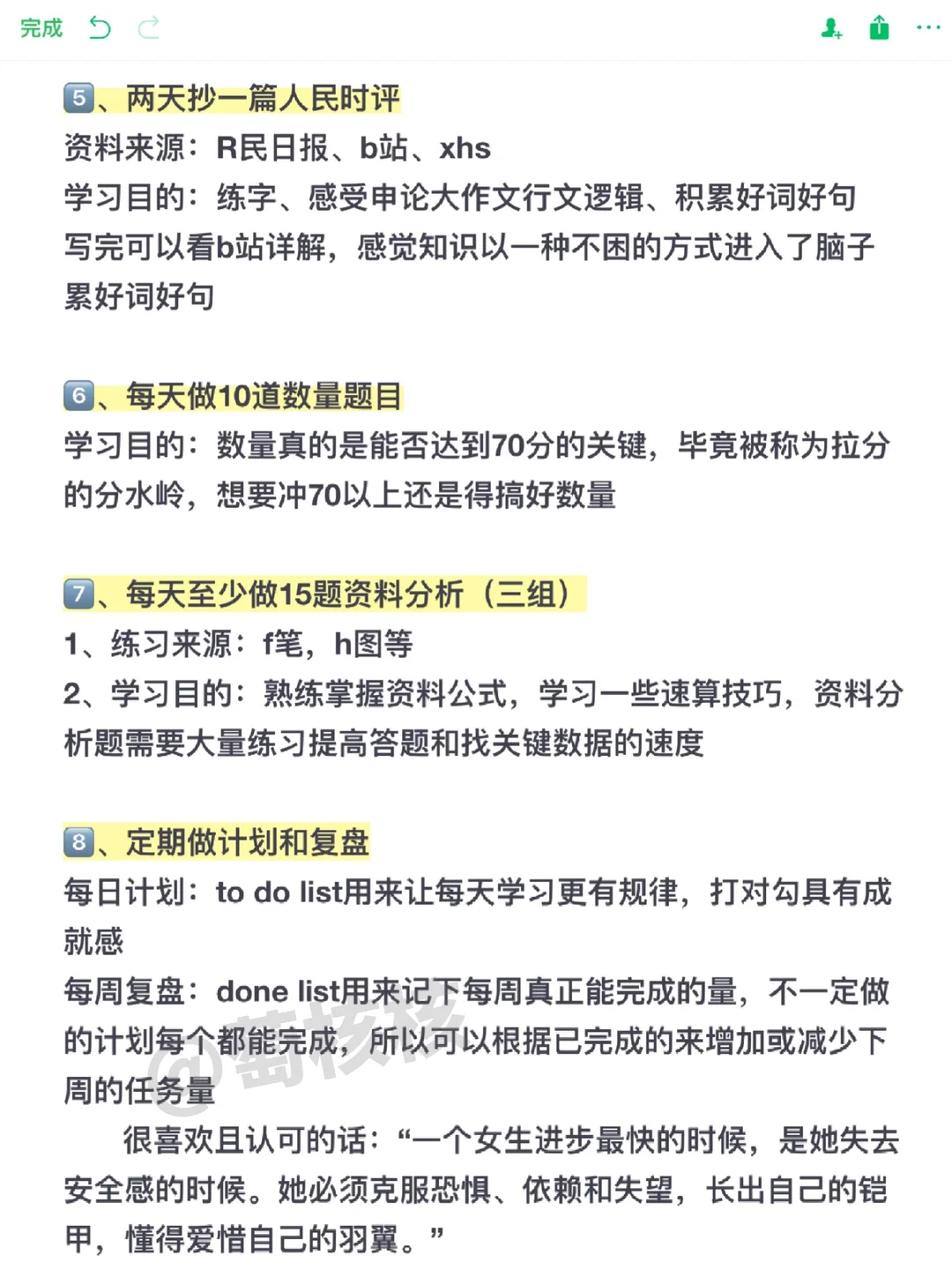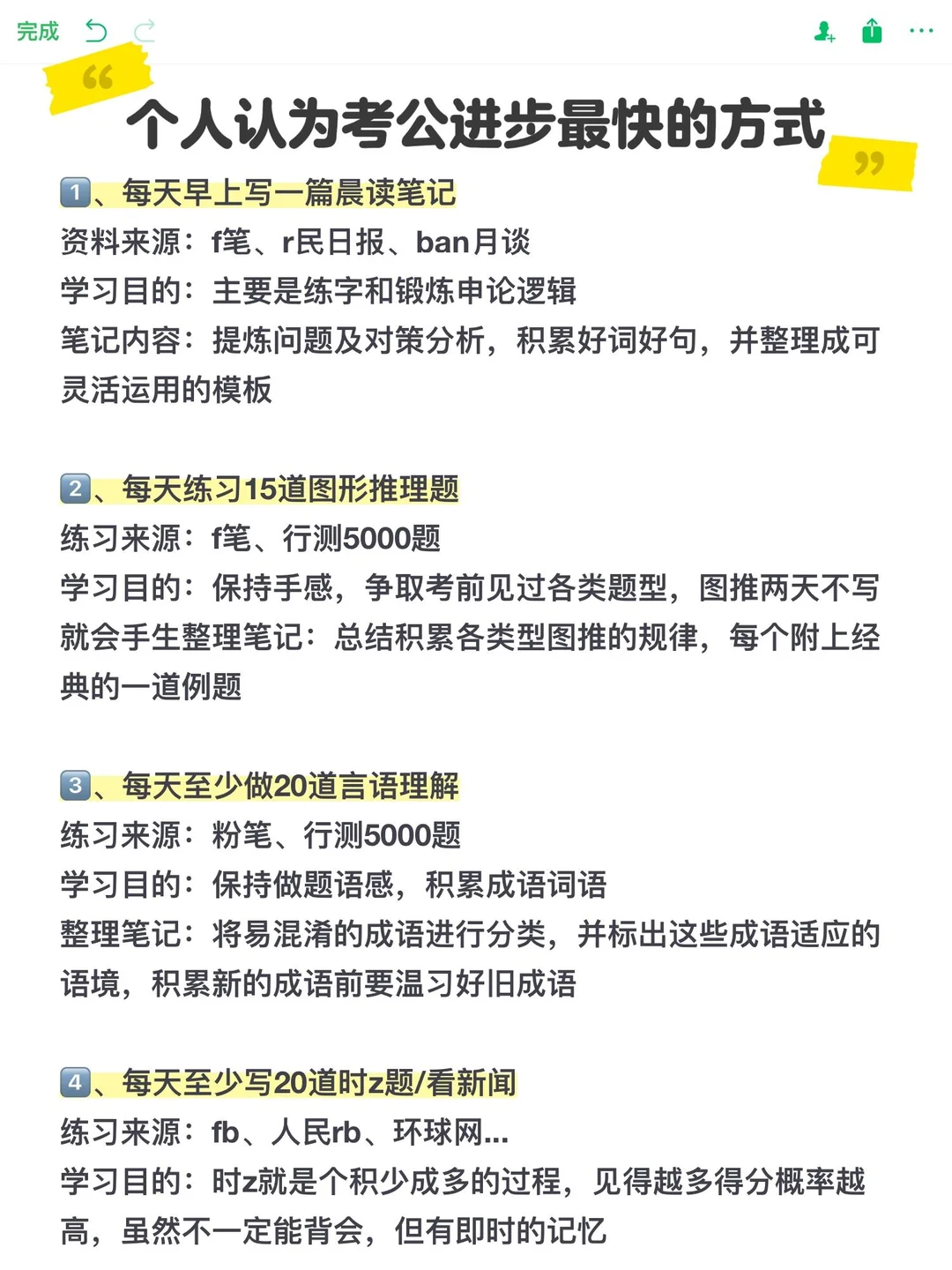 2、行测:最快的提分方法是刷真题+整理错题模块,复习推荐顺序:判断一言语一资料一数量一常识,重心放在前三个板块,正确率不低于80%后再去攻数量和常识