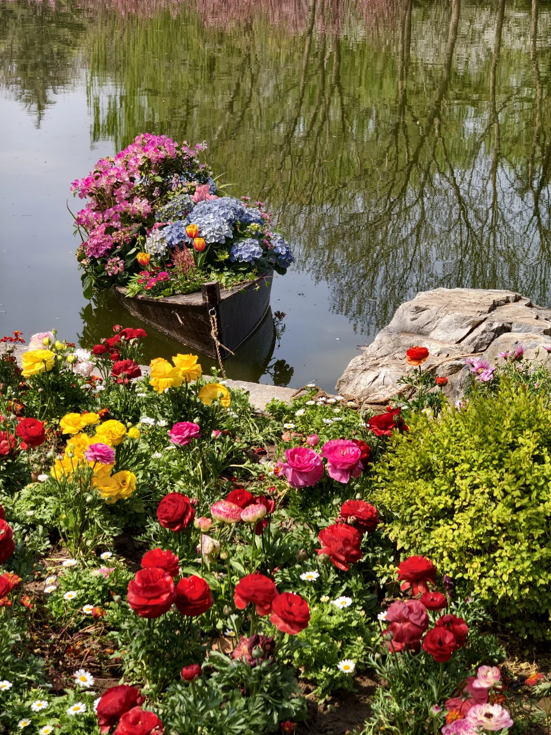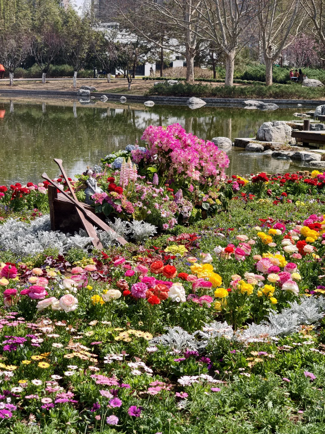 公园中心湖面停泊着几艘高颜值花船,装饰了大团花簇