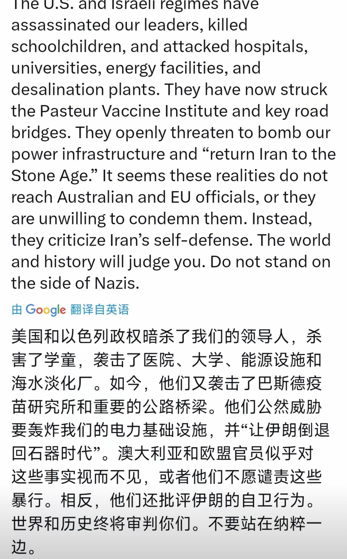 伊朗驻英使馆4月3日发声相关推文 伊朗驻英国大使馆今天(北京时间4月3日)发文写道:“美国和以色列政权暗杀了我们的领导人,杀害了学童,袭击了医院,大学,能源设施和海水淡化厂。如今,他们又袭击了巴斯德疫苗研究所和重要的公路桥梁。他们公然威胁要轰炸我们的电力基础设施,并‘让伊朗倒退回石器时代’。澳大利亚和欧盟官员似乎对这些事实视而不见,或者他们不愿谴责这些暴行。相反,他们还批评伊朗的自卫行为。世界和历史终将审判你们。不要站在纳粹一边。” 这份强硬发声,是伊朗在接连遭遇打击后,对西方阵营的公开控诉,也把中东冲突的矛盾焦点,从军事对抗拉到了道义层面,直指西方双标态度。 近一个月来,中东地区民用设施遭袭次数超百次,民生相关设施损毁率持续攀升,普通民众的生活受到极大冲击,伊朗此番表态,恰好戳中了西方对冲突双方评判标准不一的痛点。 西方多国一边呼吁局势降温,一边对伊朗遭遇的袭击选择沉默,甚至将伊朗的反制举措定义为挑衅,这种立场偏差,让地区冲突的解决难度持续加大。 冲突的核心从来不是单纯的军事对抗,而是西方双重标准下的失衡博弈,一味偏袒只会让局势持续升级,唯有客观看待各方诉求,停止针对民用目标的打击,才能真正缓和地区紧张态势。