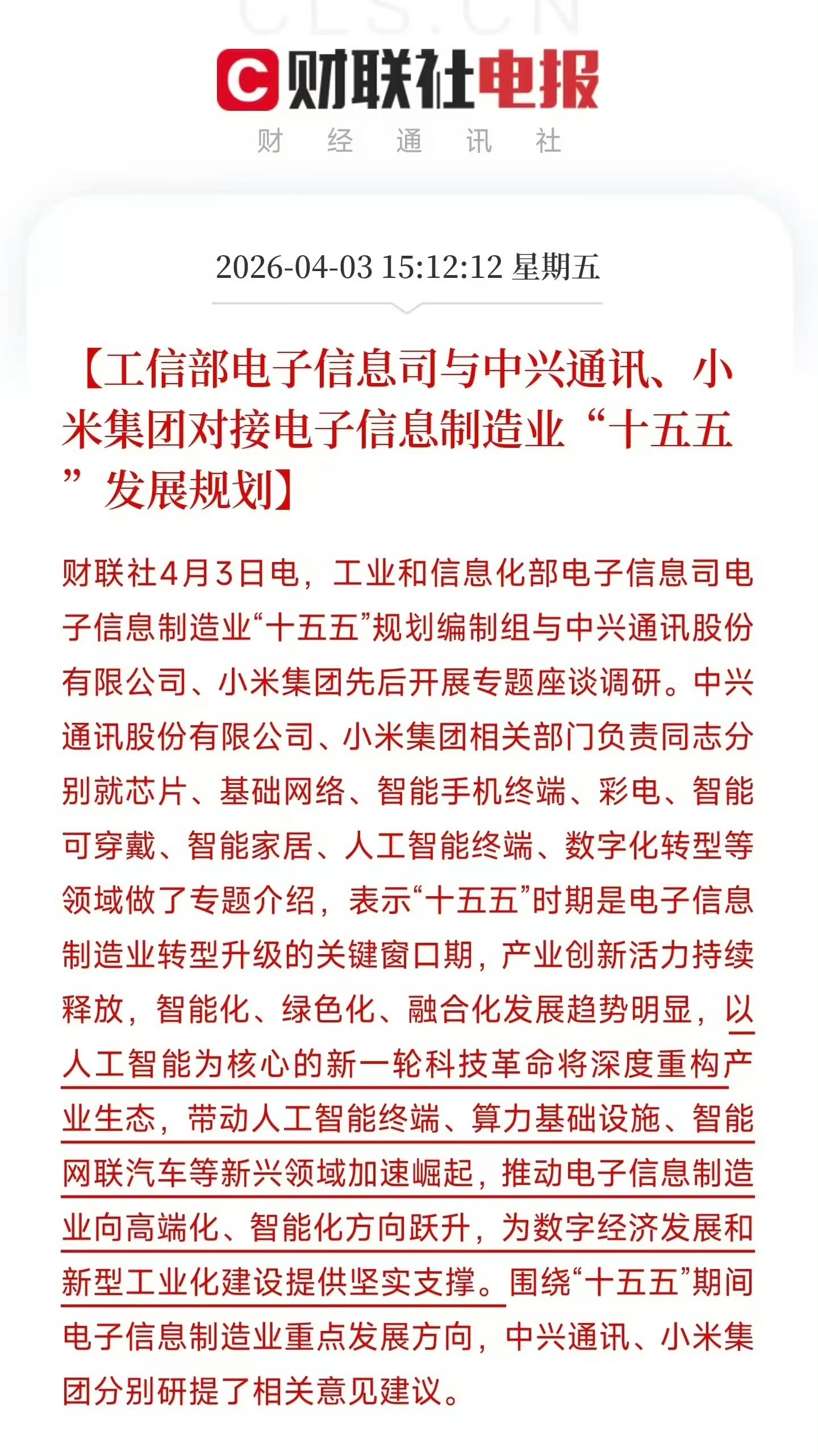 工信部电子信息司与中兴通讯、小米集团对接电子信息制造业“十五五”发展规划。