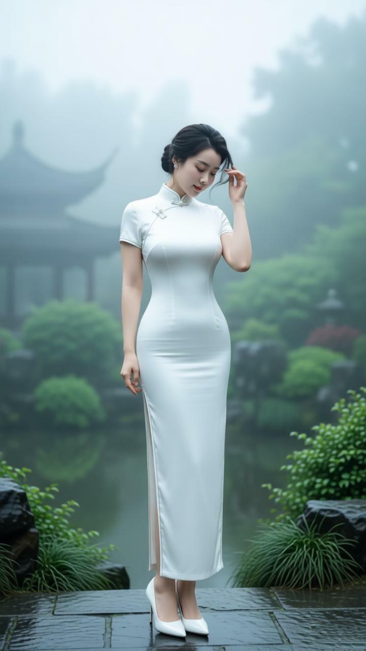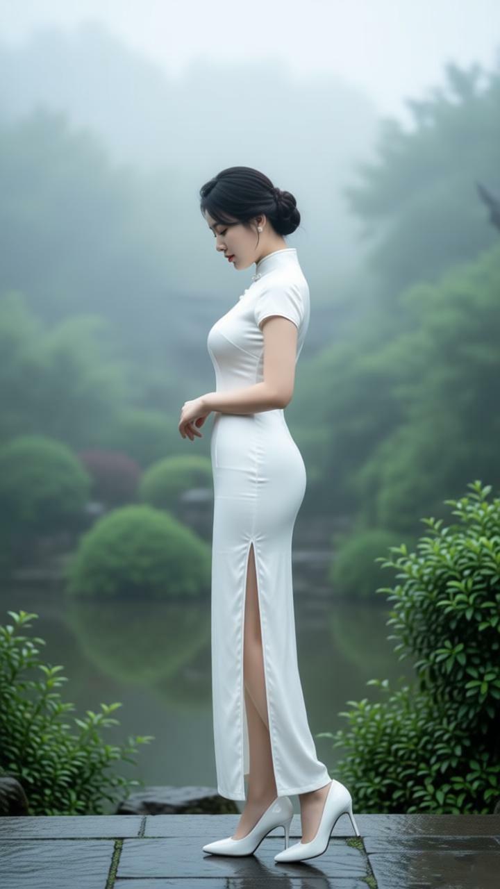 青山被云雾轻轻绕着,她穿一身白旗袍,带着东方美。