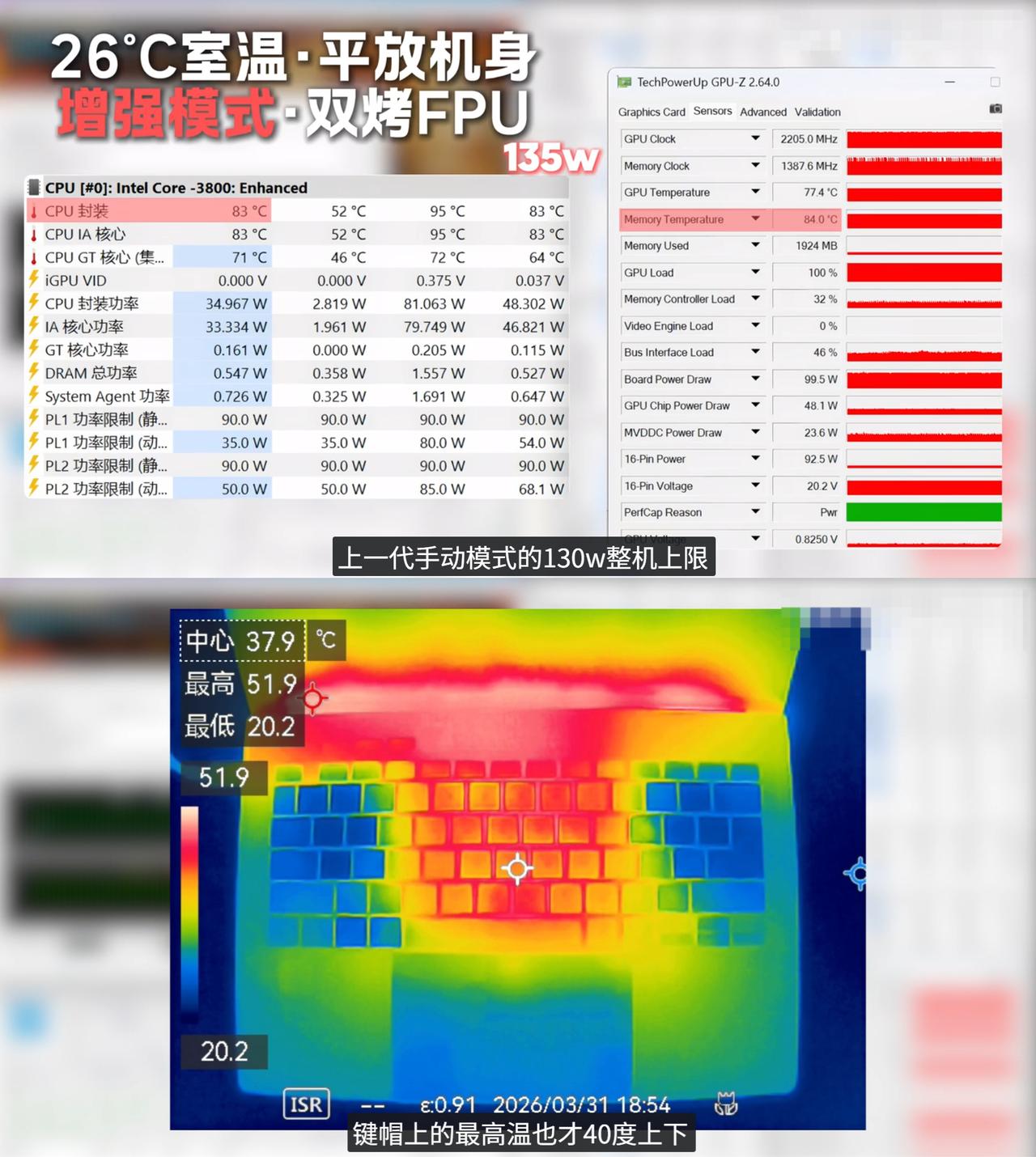 150W性能释放温度还低了!ROG你认真的? 刚刚看到博主麦香牛奶评测ROG幻14 Air 2026的视频,我觉得最离谱的就是性能跟散热。 增强模式下性能释放直接就来到了135W,超过了上代的130W上限,满载可以来到150W,但是ROG幻14 Air 2026的性能上去了,表面温度反而下来了,双烤键盘表面只有40度左右,相当离谱。 据博主说ROG这次是把散热全部重新优化了,包括进风口、风扇、热管、屏轴出风,一整套全换! 续航那边也是夸张,PCMARK10续航测试跑到了16小时24分钟,超过去年测过的所有核显轻薄本,当然这不是牺牲重量换来的,主要还是换了Intel的Panther Lake,首发18A制程,能效比极为优秀的Ultra 9 386H所带来的. 屏幕也顺手升级了,OLED 1100nits峰值,抗反射涂层SCI反射率1.37%,麦香牛奶说已经看齐甚至超过MacBook Air了。 目前看下来ROG幻14 Air 2026基本上是把前两代的短板挨个补了一遍,说是现在14英寸独显轻薄本的天花板一点也不为过。 现在还没开卖,建议大家先蹲着,毕竟按现在的内存行情,首发买应该是最划算的。