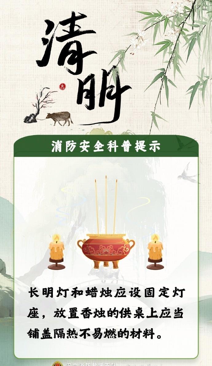 【清明将至,防火第一!这份祭扫安全提醒请收好】缅怀先人,更要守护生者。这些安全底线请大家务必牢记: 挑好位置: 祭扫时绝对远离林区杂草等易燃物品; 改变习惯: 尽量不随意焚烧纸钱、燃放鞭炮,倡导鲜花祭扫; 人走火灭: 若有明火,离开前务必反复确认火源已彻底熄灭! 星星之火,可毁万亩林。严防山林火灾,一起守护我们的绿色家园!