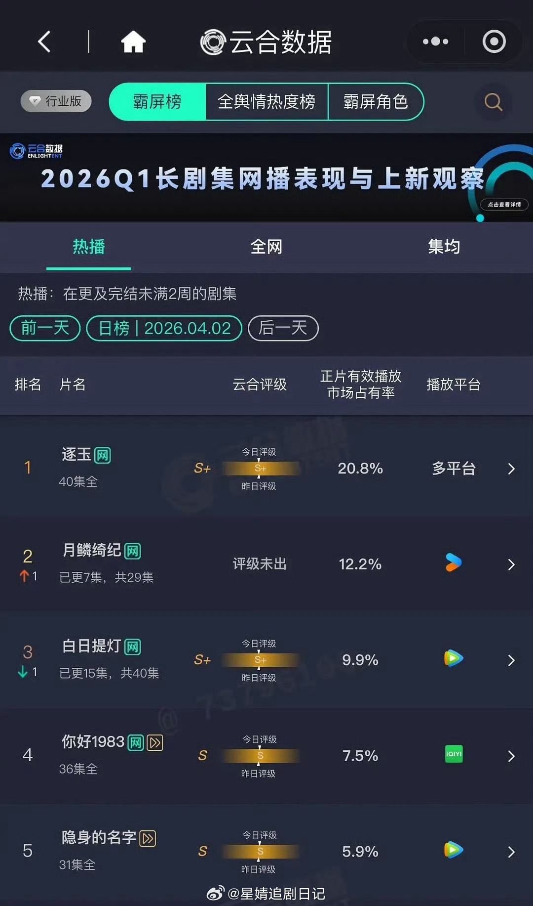 4.2云合市占率张凌赫、田曦薇《逐玉》20.8% 鞠婧祎、曾舜晞、陈都灵、田嘉瑞《月鳞绮纪》12.2% 迪丽热巴、陈飞宇《白日提灯》9.9% 周也、翟潇闻《你好1983》7.5% ……恭喜啊 90对打再次惨败 月鳞绮纪破万,月鳞绮纪数据,鞠婧祎优酷平台双破万一番女主