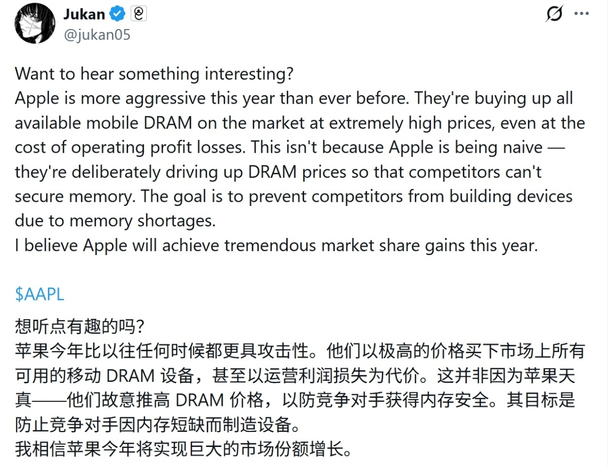 苹果凭借充裕的现金流扫货内存,把友商成本推高……华为、三星还好,性价比品牌直接就能被打死。