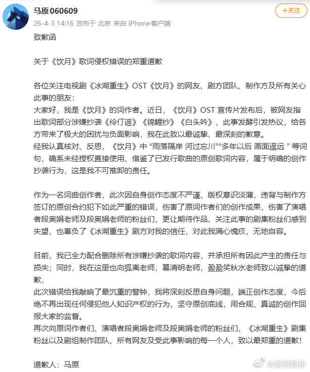 冰湖重生回应OST抄袭冰湖重生剧方道歉 有网友发现《冰湖重生》OST歌词疑似抄袭三首经典古风歌曲,引发热议。刚刚,OST制作方发声明回应,称歌曲系三年前创作,创作过程中作词参考了类似的意境作品,确实未能做到完全独立原创。词作者随后也发文道歉。冰湖重生OST歌词被指抄袭