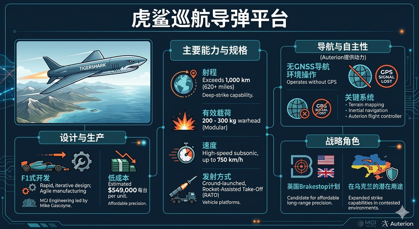 2️⃣ 核心技术优势- 无 GPS 环境作战: 针对强电磁干扰环境设计,在 GNSS(全球导航卫星系统) 信号丢失的情况下,依靠地形匹配、惯性导航以及 Auterion 飞行控制系统,仍能精准执行任务。- F1🏎️ 式开发模式: 由前 F1 技术总监 Mike Gascoyne 领导,将赛车行业的“快速迭代、敏捷制造”理念引入军工领域,显著缩短研发周期。- 极致性价比: 预估单价约 54.9 万美元。相比传统高价值巡航导弹,TigerShark 以极低的成本实现了类似的远程打击效果,适合大规模消耗战。